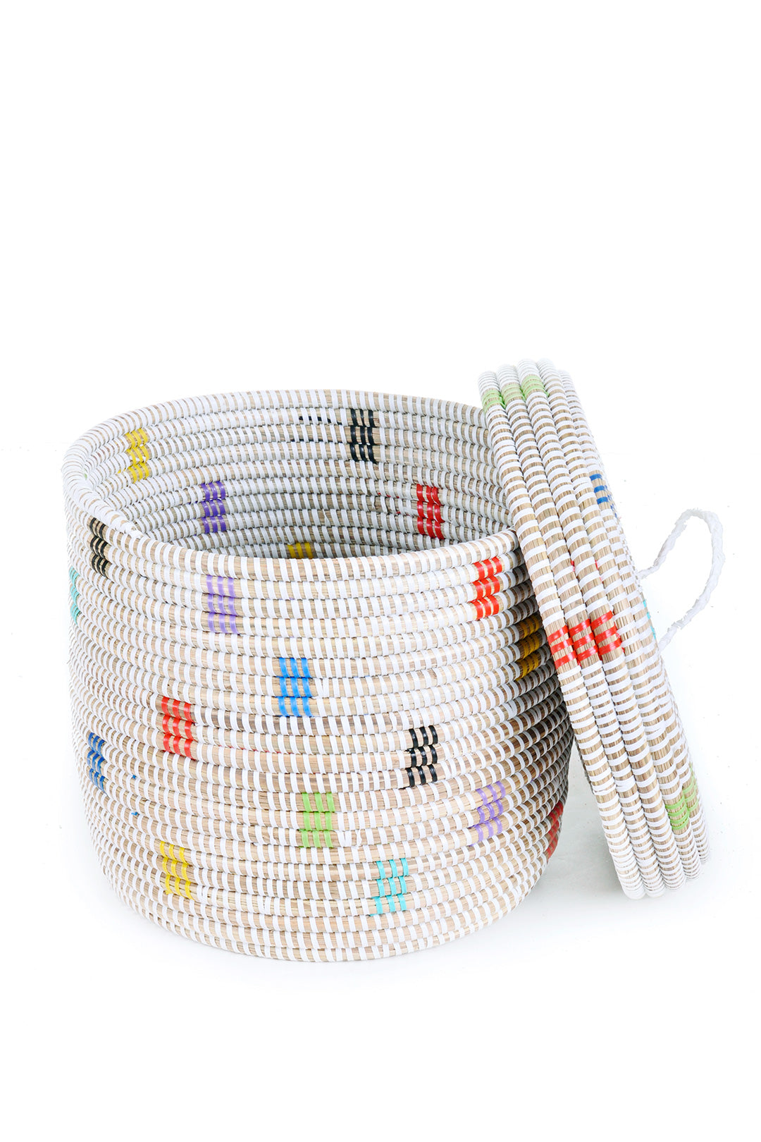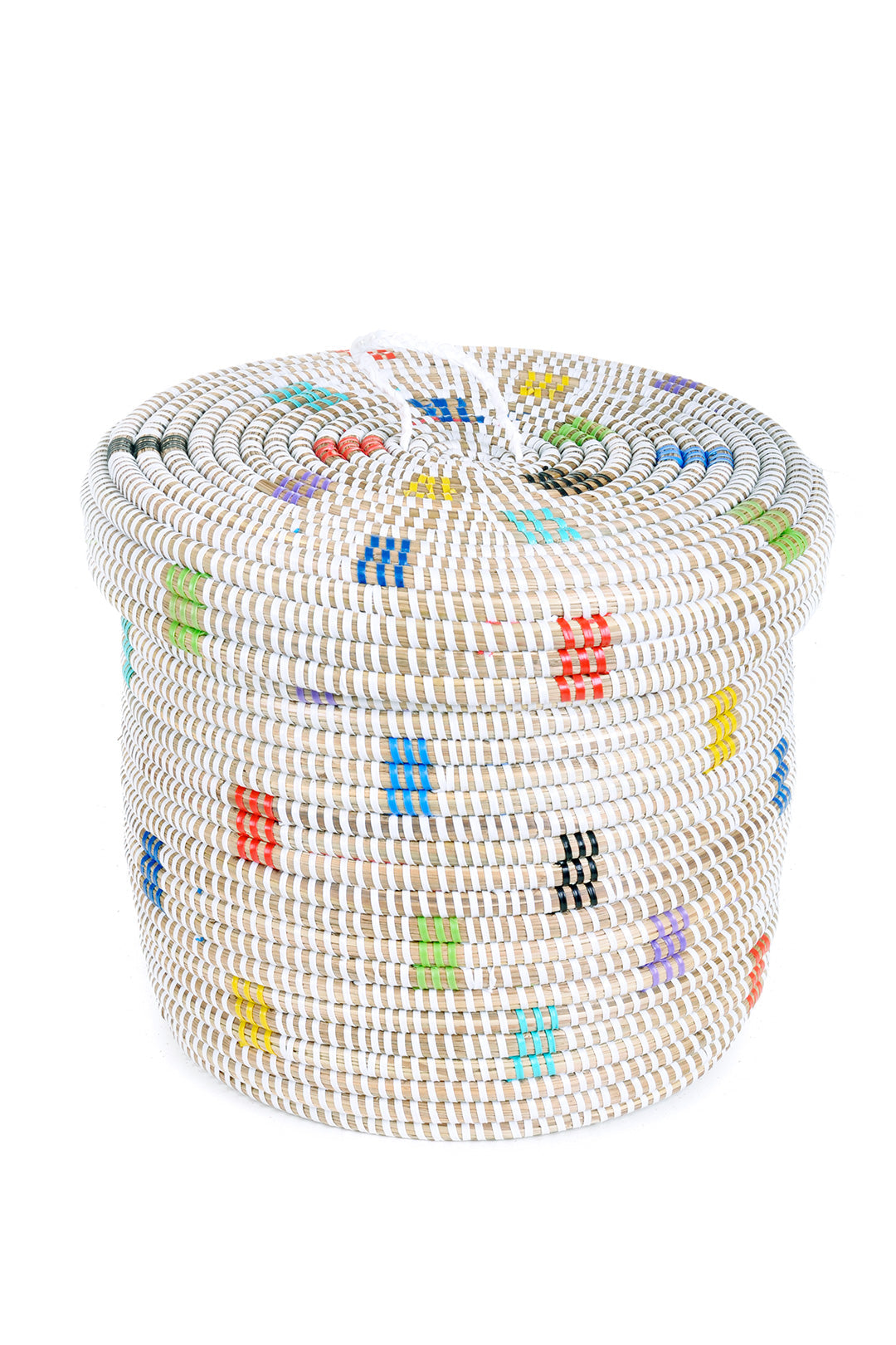 Wolof women in Senegal weave this colorful storage container by binding cattail stalks with strips of plastic recycled from prayer mats or purchased new at the mat factory in Dakar.