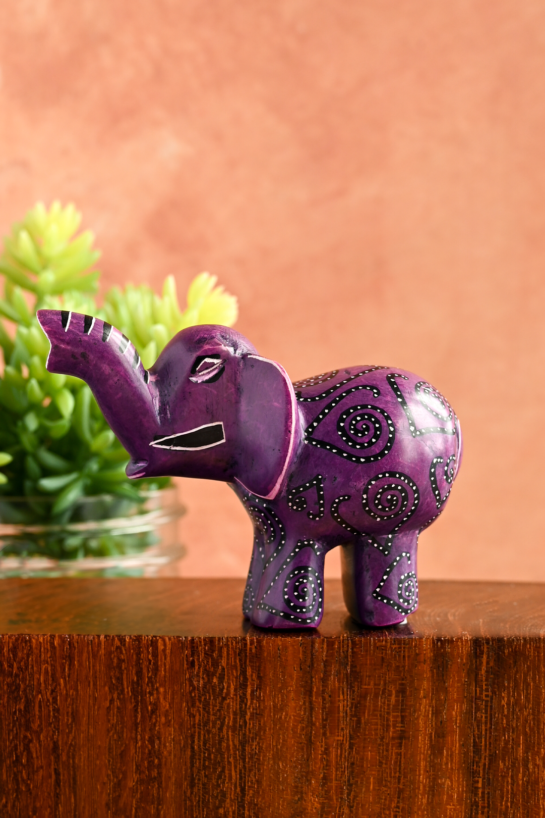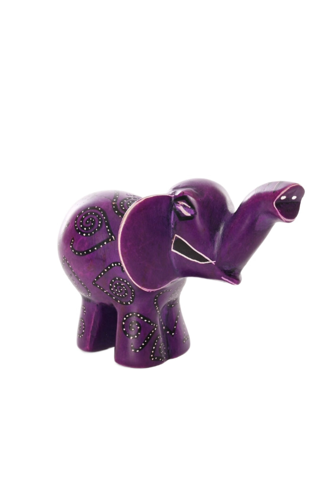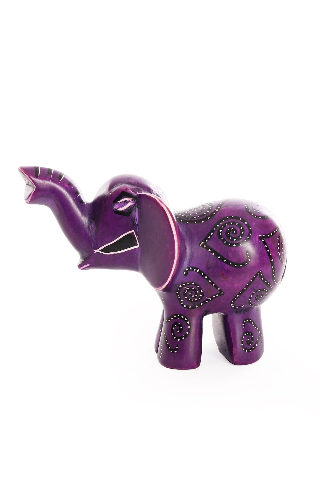 Kenyan artisans hand carve sweet elephant sculptures from soft soapstone, then hand dye each piece with pretty purple dye. Hand-painted and etched designs of swirled hearts add personality.
