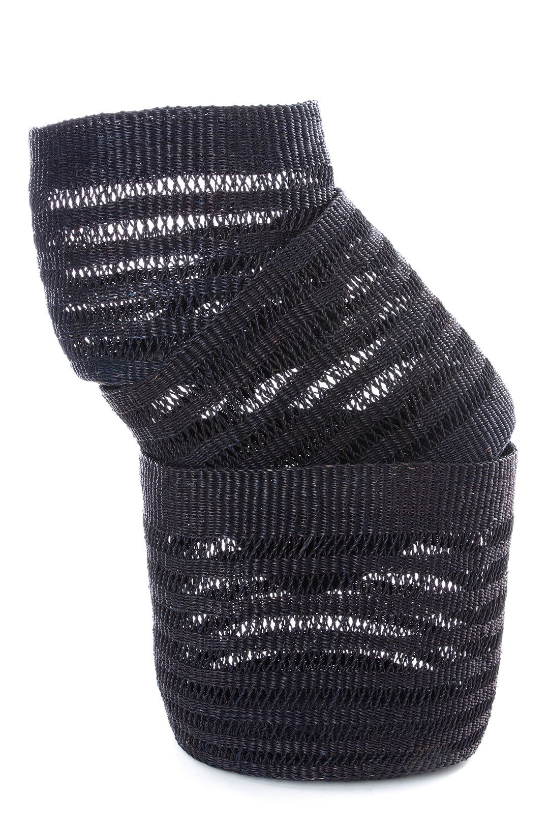 Elephant grass produces stiff stalks that weavers in Ghana's northern Bolga region excel at weaving. Weavers use an airy lacework design to create these beautiful storage bins in a deep blue-black. The all-natural grass can be wet and reshaped whenever desired.