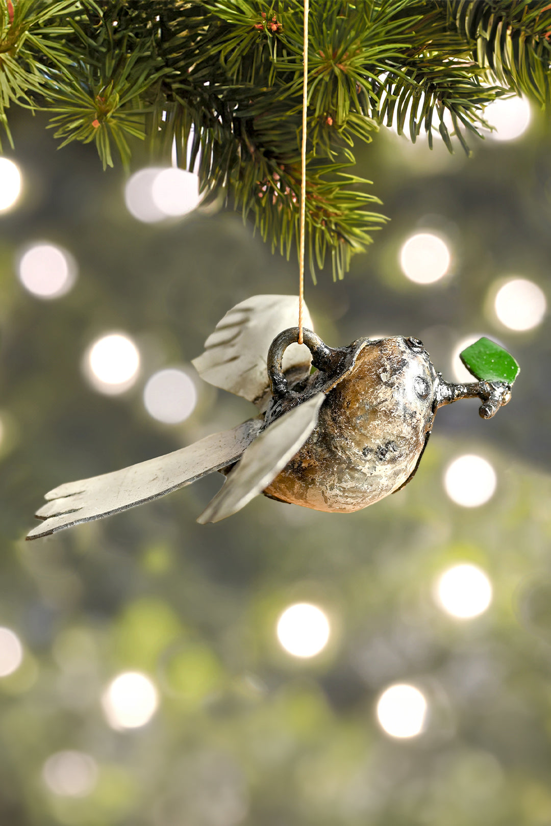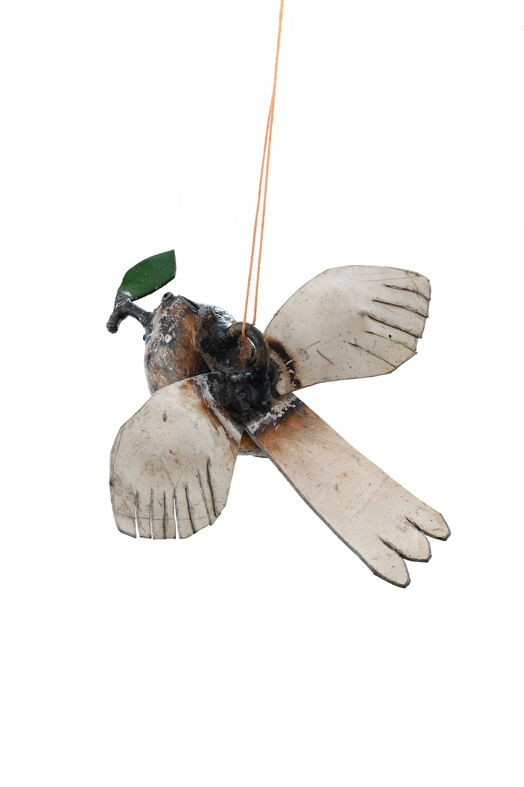 Zimbabwean artisans transform discarded metal into these sweet white dove ornaments or hanging decorations for all seasons. Each dove gently holds a green leaf in its beak.