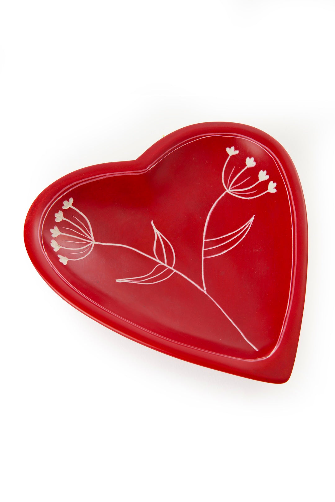 Kenyan artisans hand carve a beautifully contoured heart-shaped dish from soft soapstone, then add a deep red dyed finish and an etched floral print pattern. This handcrafted decorative piece makes a lovely gift!
