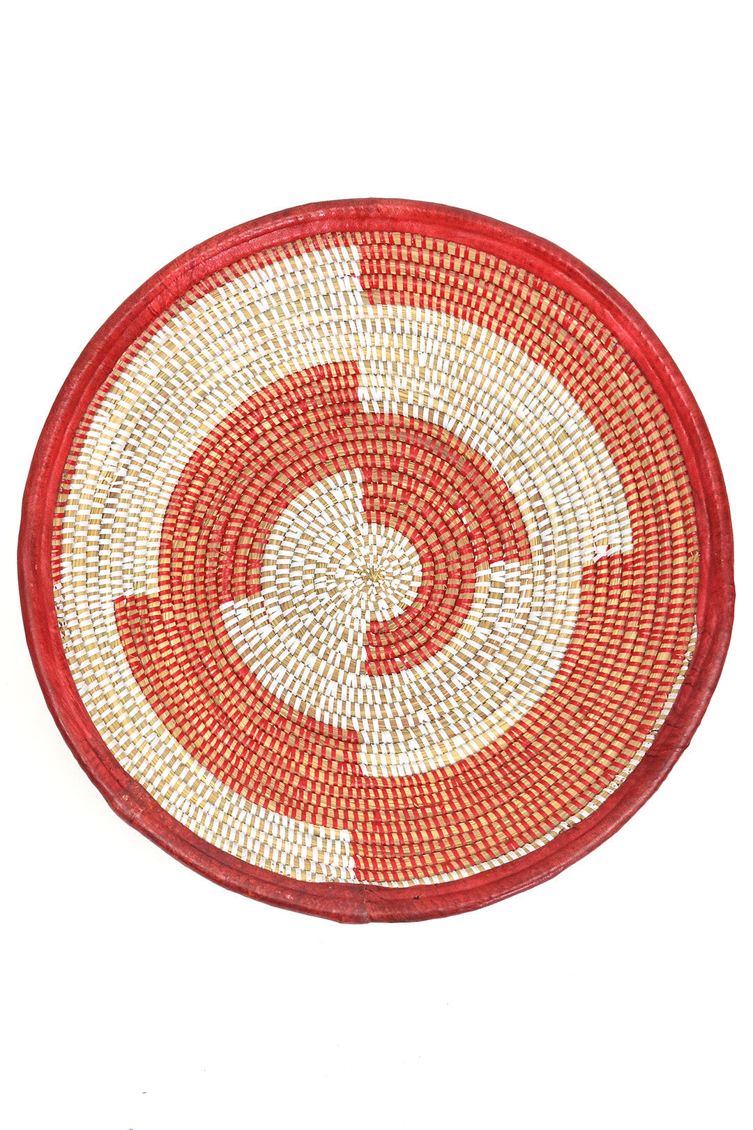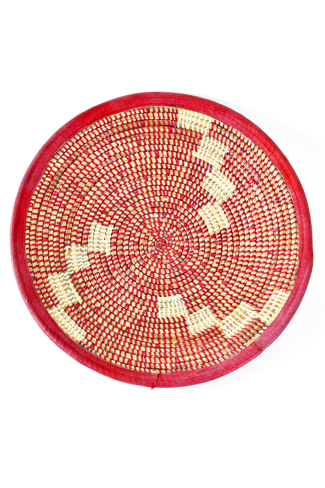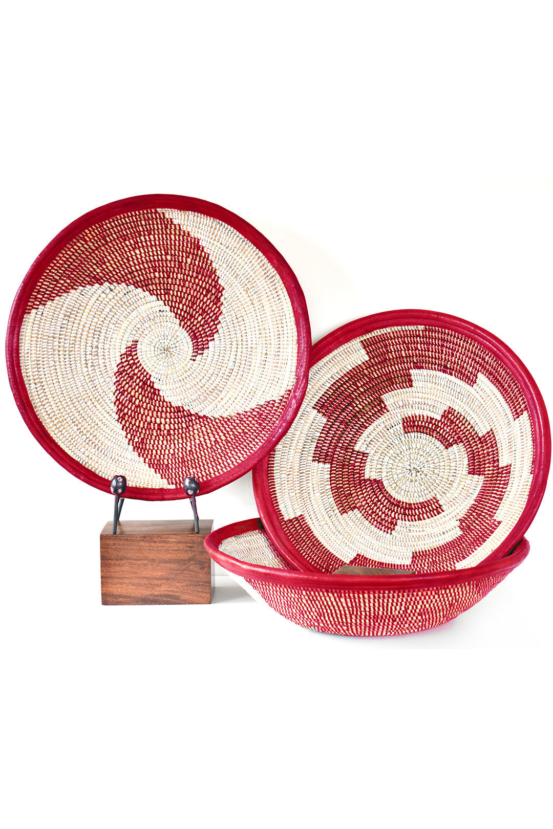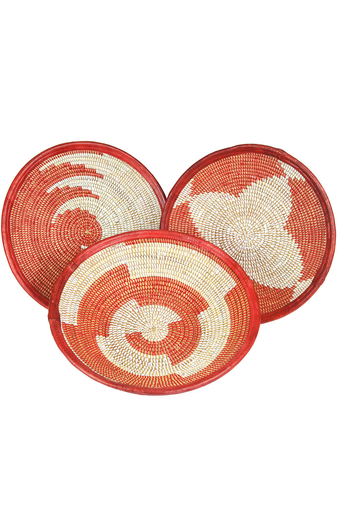 Talented Wolof basket weavers in rural Senegal transform abundant cattail stalks and salvaged plastic strands to create useful tabletop baskets that double as art. Each basket features a unique woven design, and a rim bound in soft red leather.