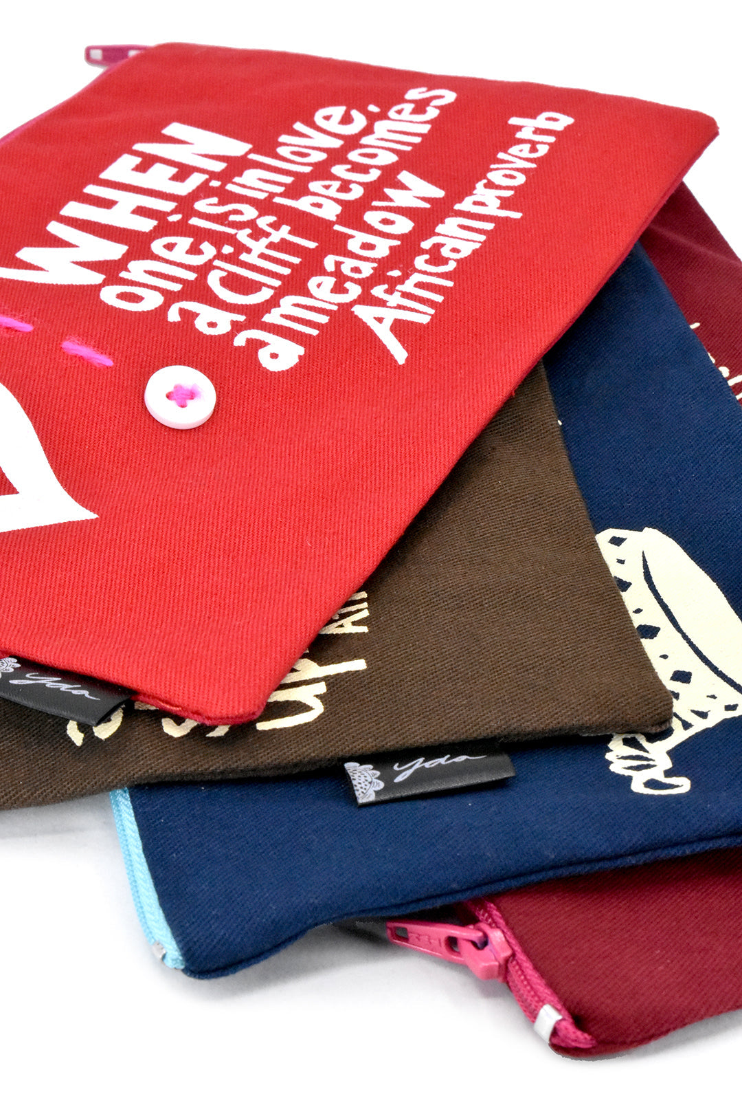 At Yda Walt Studios in Johannesburg, South Africa, talented owner/designer Yda Walt and a small team of artisans dream up inspirational products centered on South African life and ethos. Beautifully screen printed, lined and finished with a contrasting zipper, this flat pouch showcases the African proverb, "When one is in love, a cliff becomes a meadow."