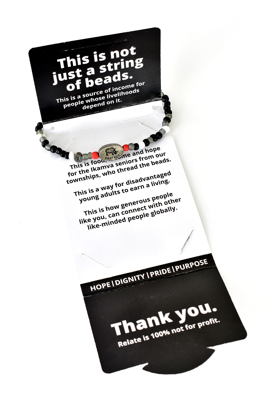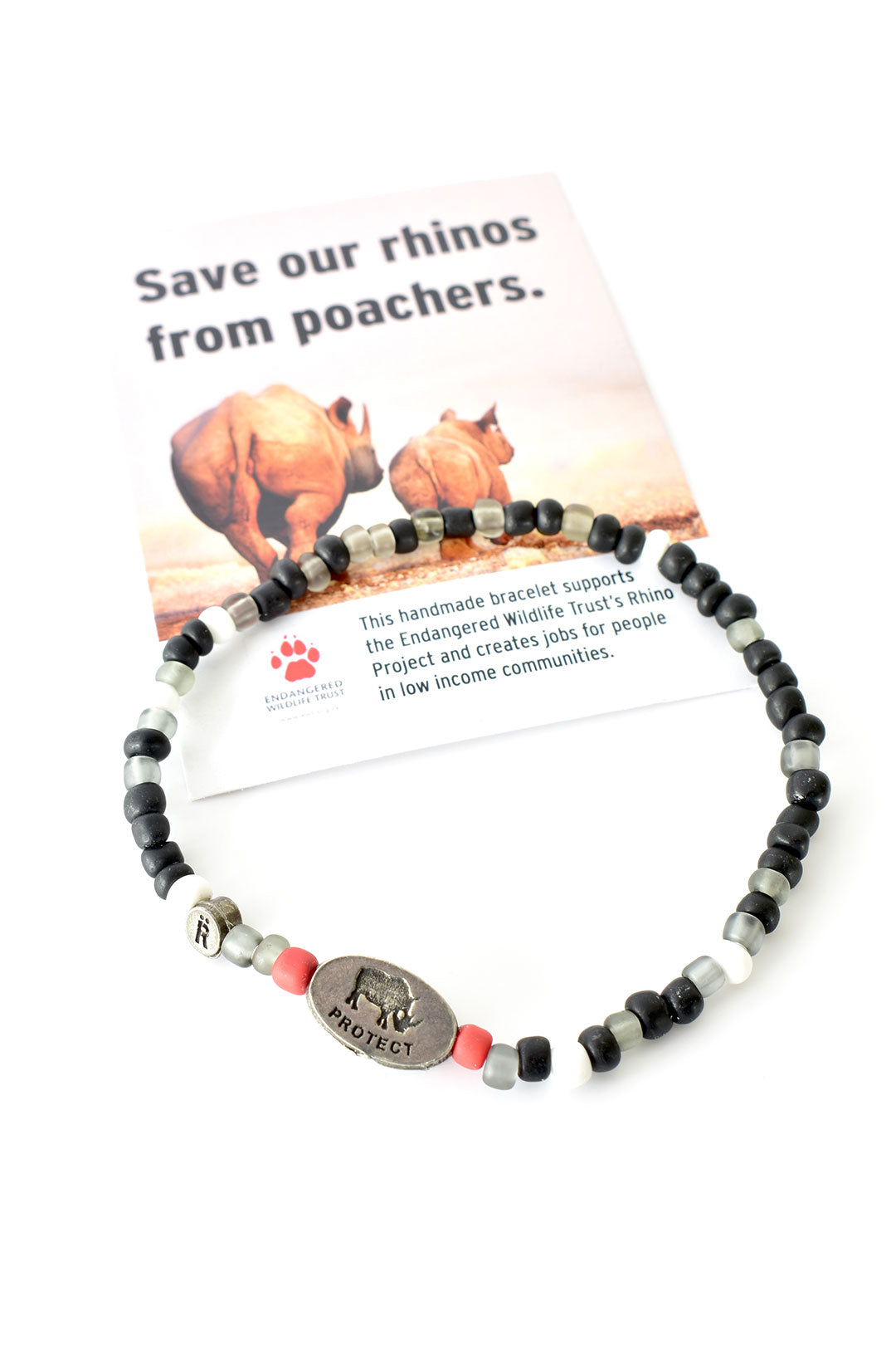 This bracelet supports the Endangered Wildlife Trust (EWT) Rhino Project. Inspired by the colours of the rhino and its surrounding habitat, each bracelet is made up of grey, white, and matte black beads, and is finished off with two red ‘accent’ beads on each side of the EWT pewter closing. Wear these cause bracelets to connect to the conservation of these iconic species.