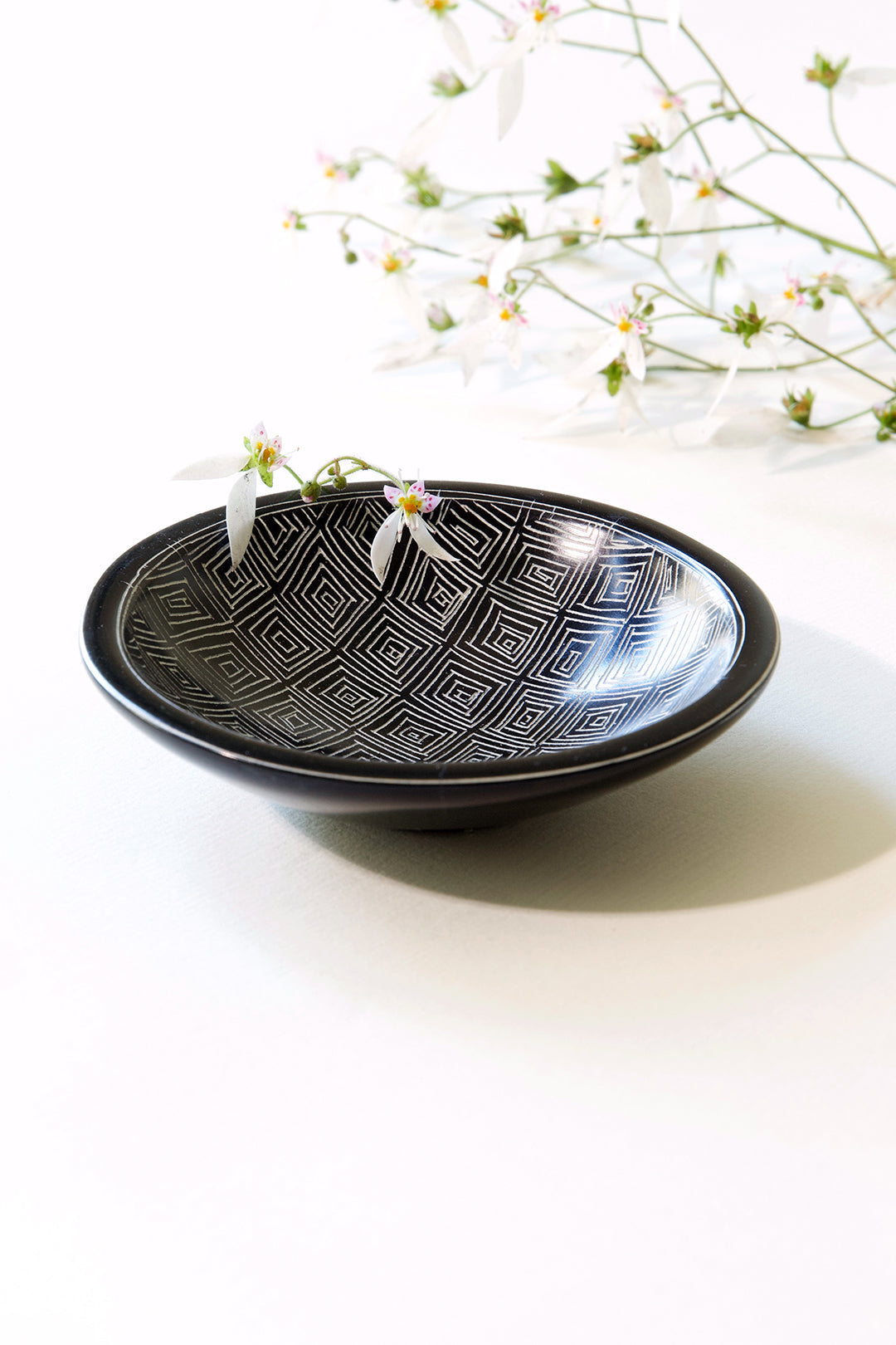 Carvers in Kenya's western highlands craft the basic form for simple round decorative bowls from soft soapstone. Artisans in a Nairobi workshop then add a chic black dyed finish and etched details inspired by the intricate high-contrast designs of Malian mudcloth.