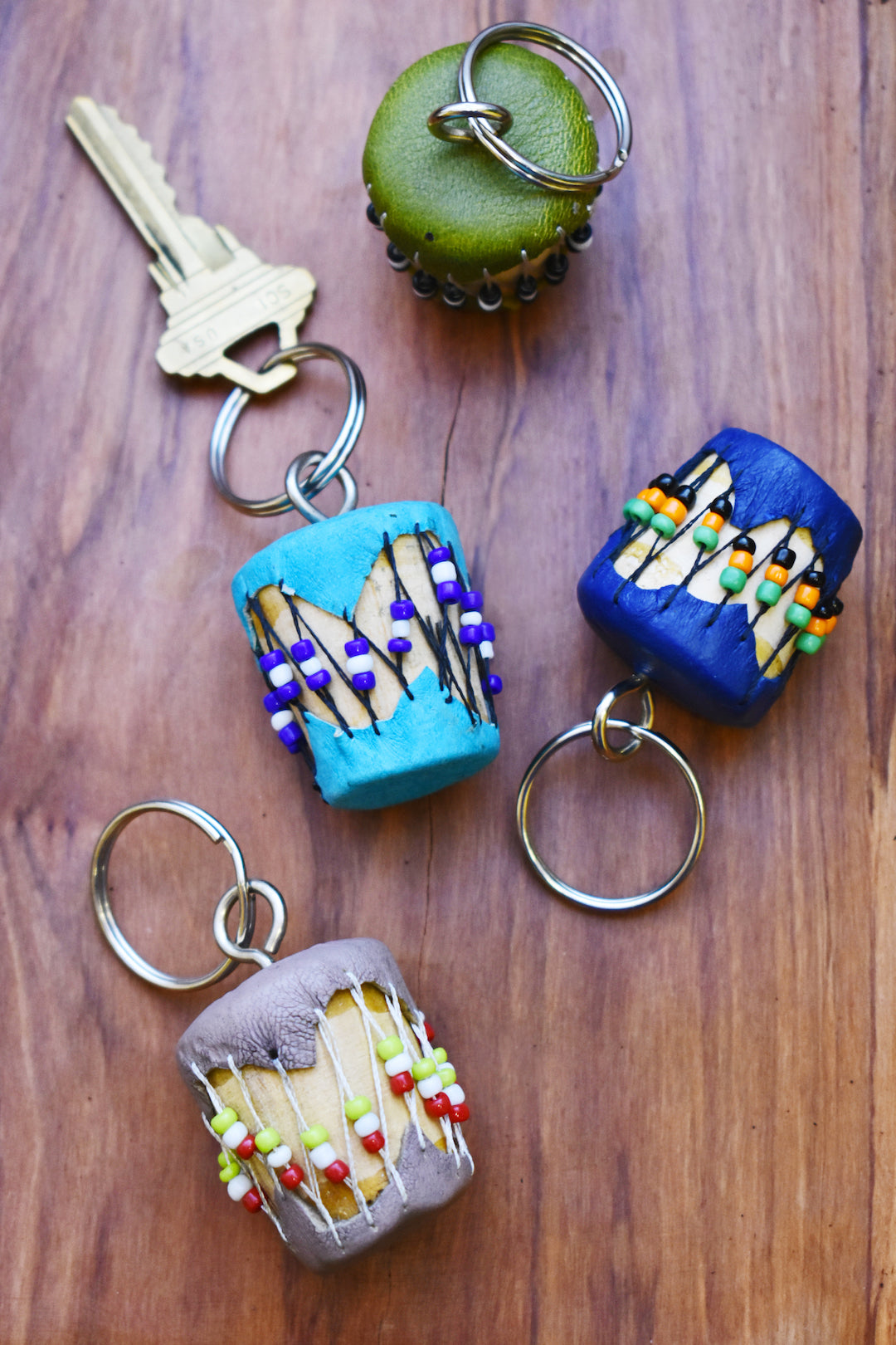 Kenyan artisans handcraft fun African drum keychains from wood, leather, beads and string. Each key ring is affixed with a sturdy split ring and chain, and features a unique color of leather and beads.