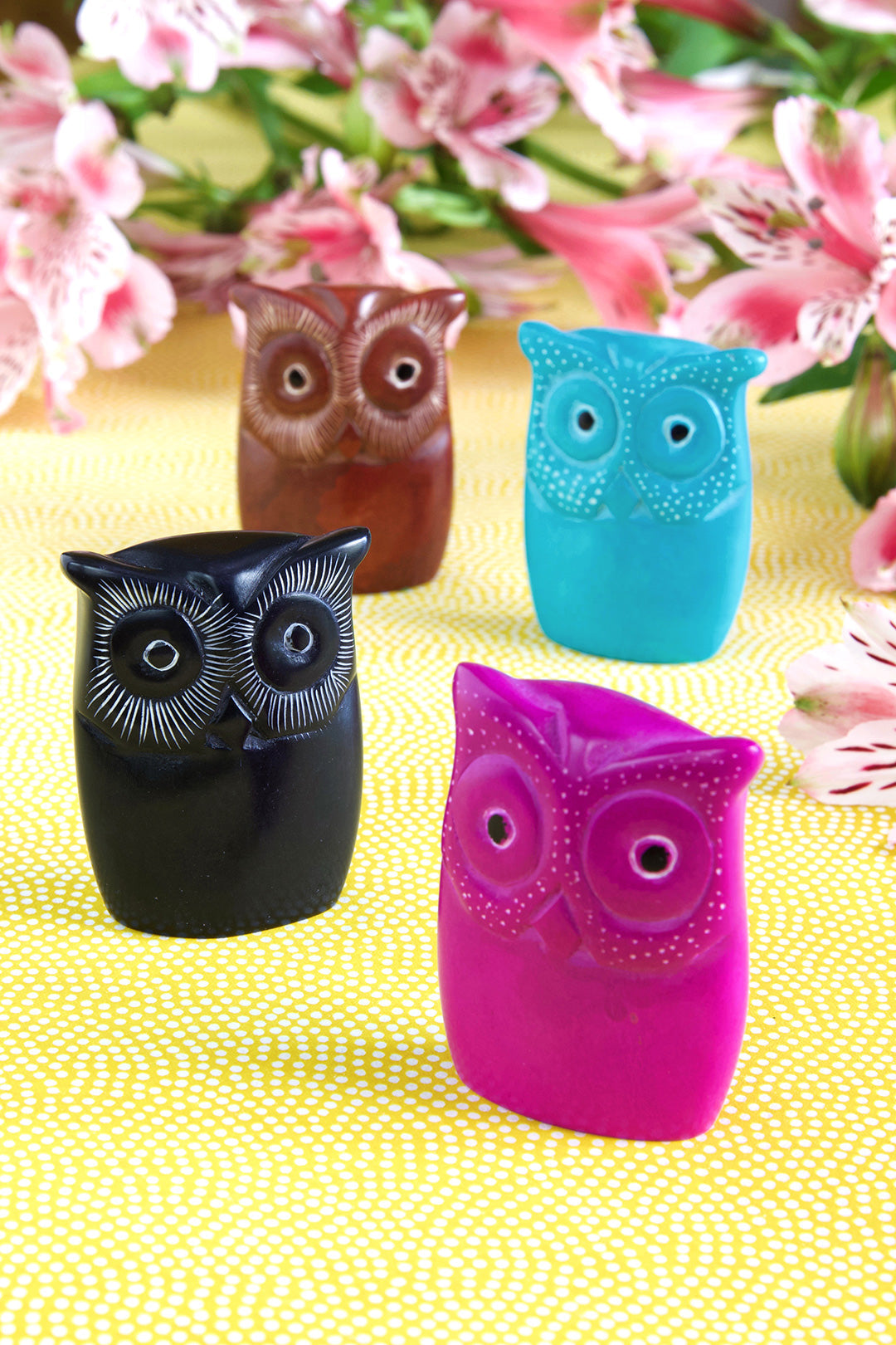 Kenyan artisans hand carve each adorable miniature wise owl from soft Kisii soapstone, then hand dye each one with bright non-toxic dyes.