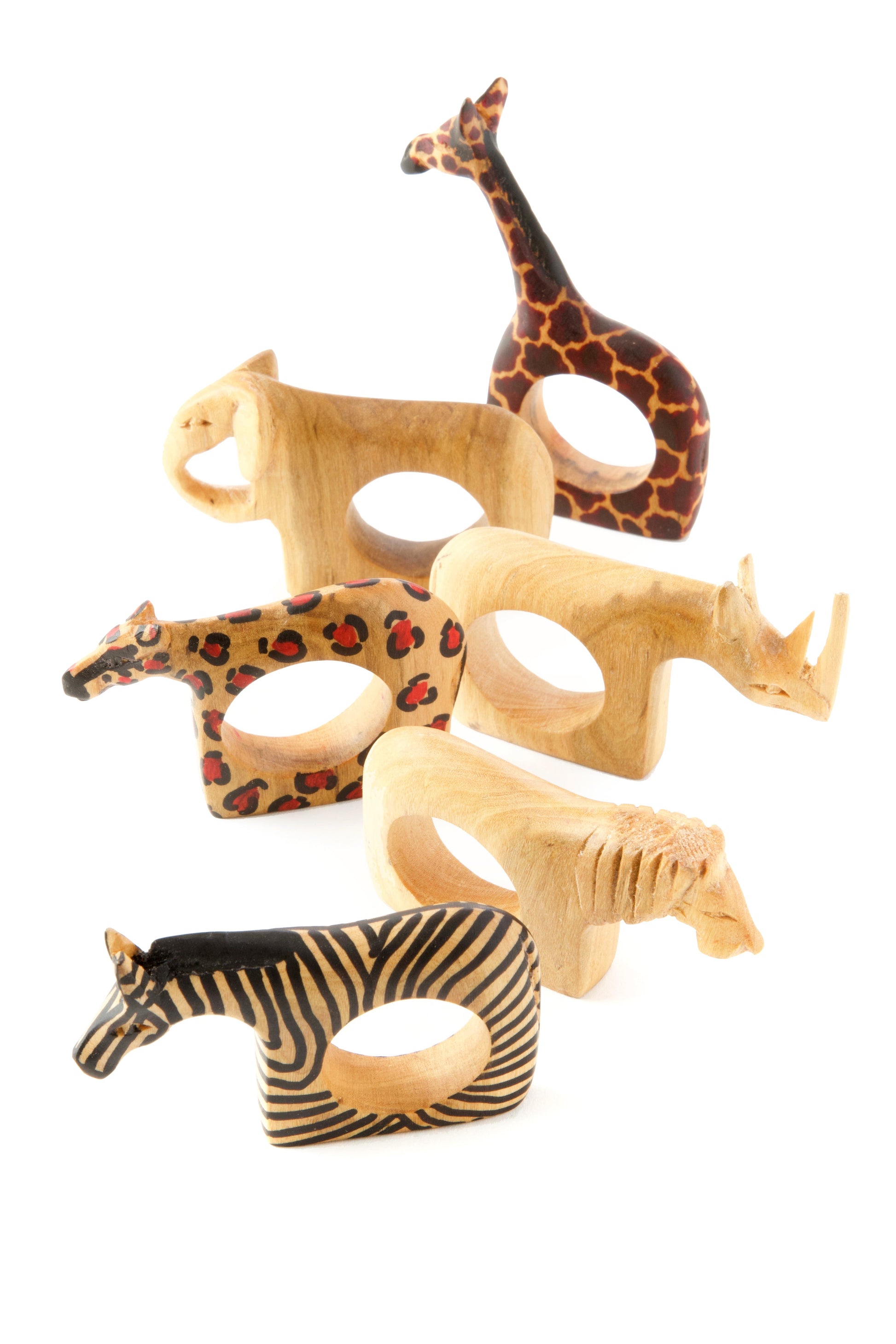 Kenyan artisans hand carve napkin rings into the shape of safari animals to bring African safari icons to the tabletop. Crafted from lightweight jacaranda wood, each set of six hand carved and hand painted napkin rings will add character to the dining room.
