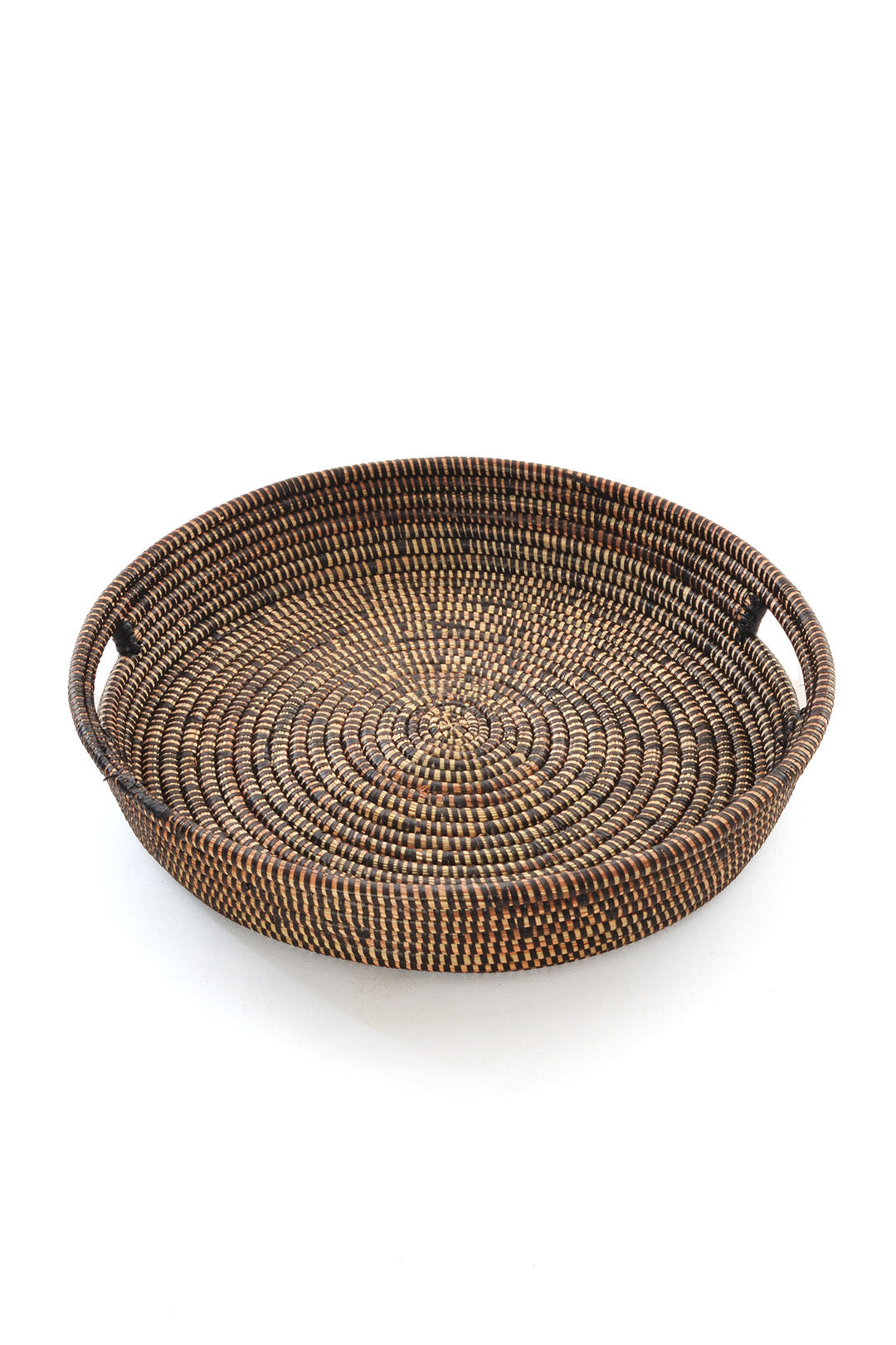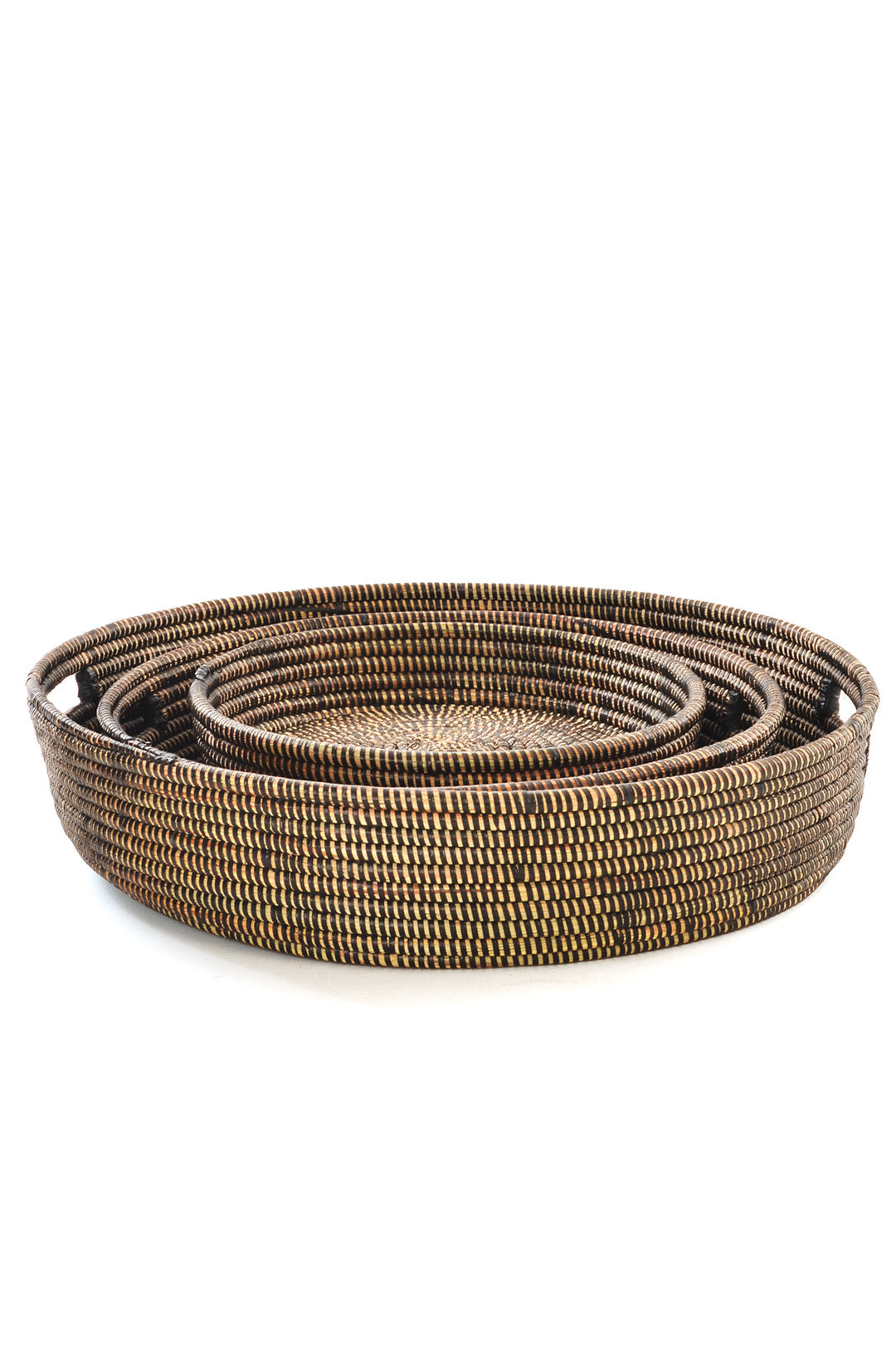 Wolof women in rural Senegal craft these chic trays from cattail stalks and strips of plastic used in the production of outdoor mats. The 2 larger trays are finished with cutout handles.