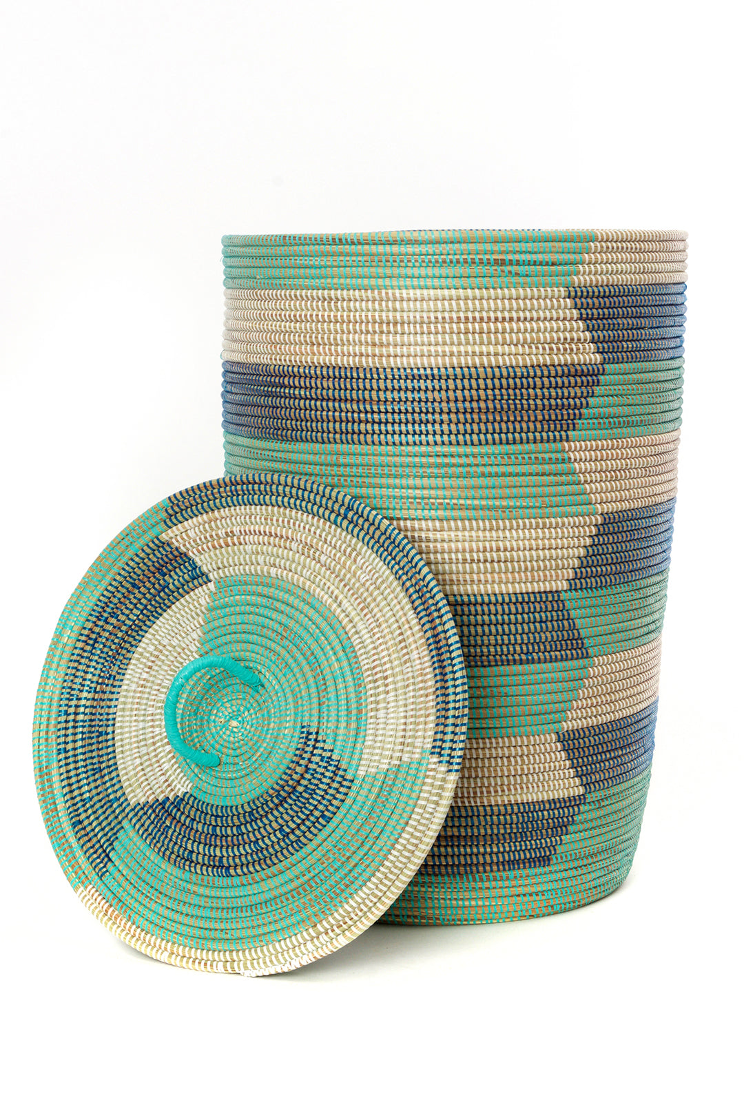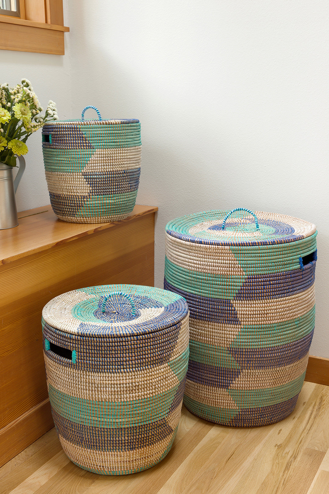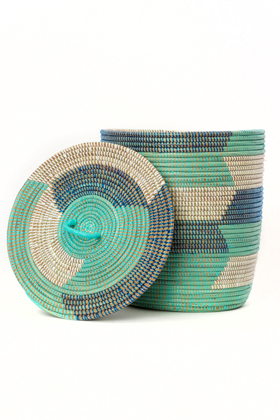 This pared-down set of handcrafted baskets features three nesting sizes in shades of dark blue, aqua blue and white. Each basket is carefully handmade by a talented Wolof woman in rural Senegal.