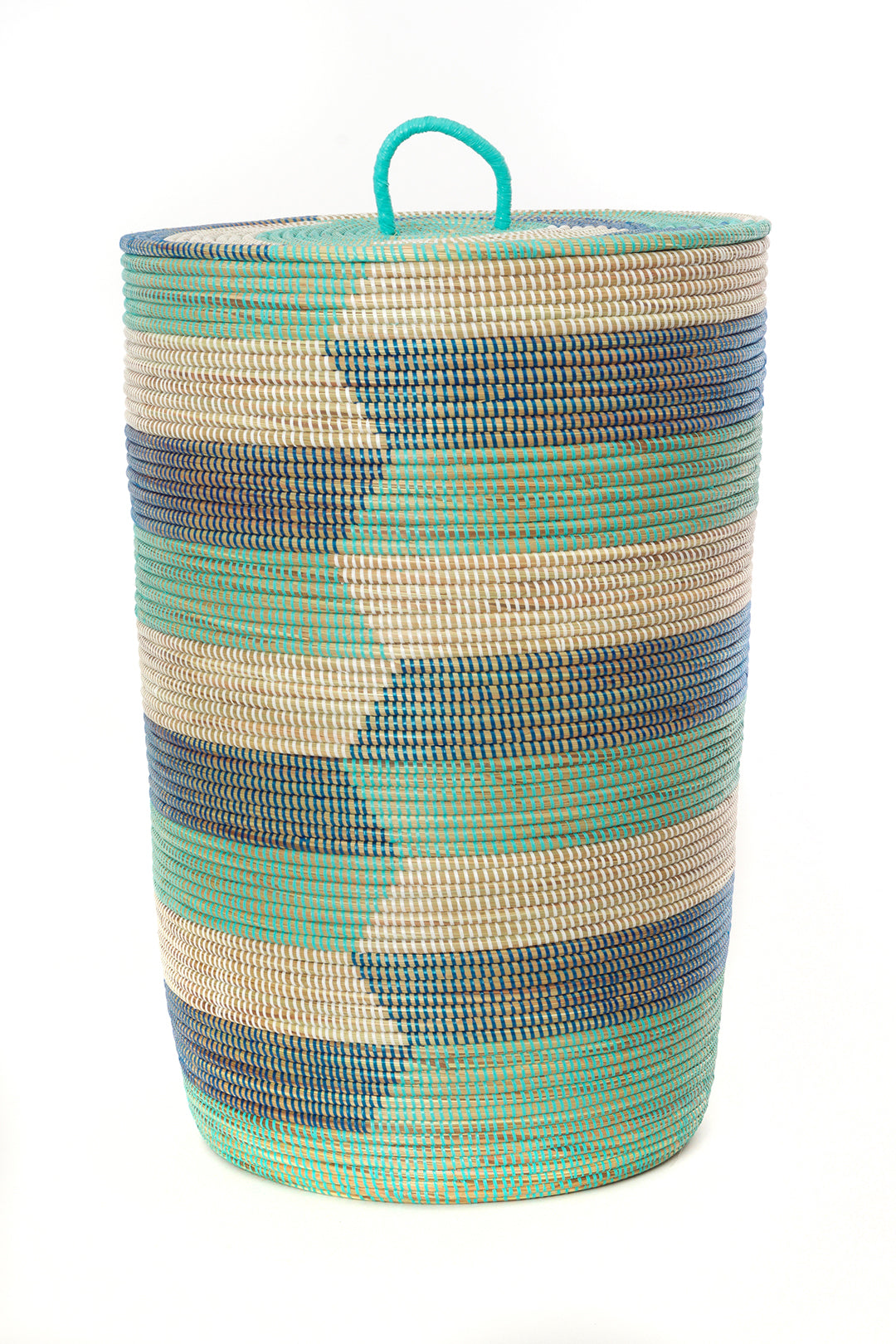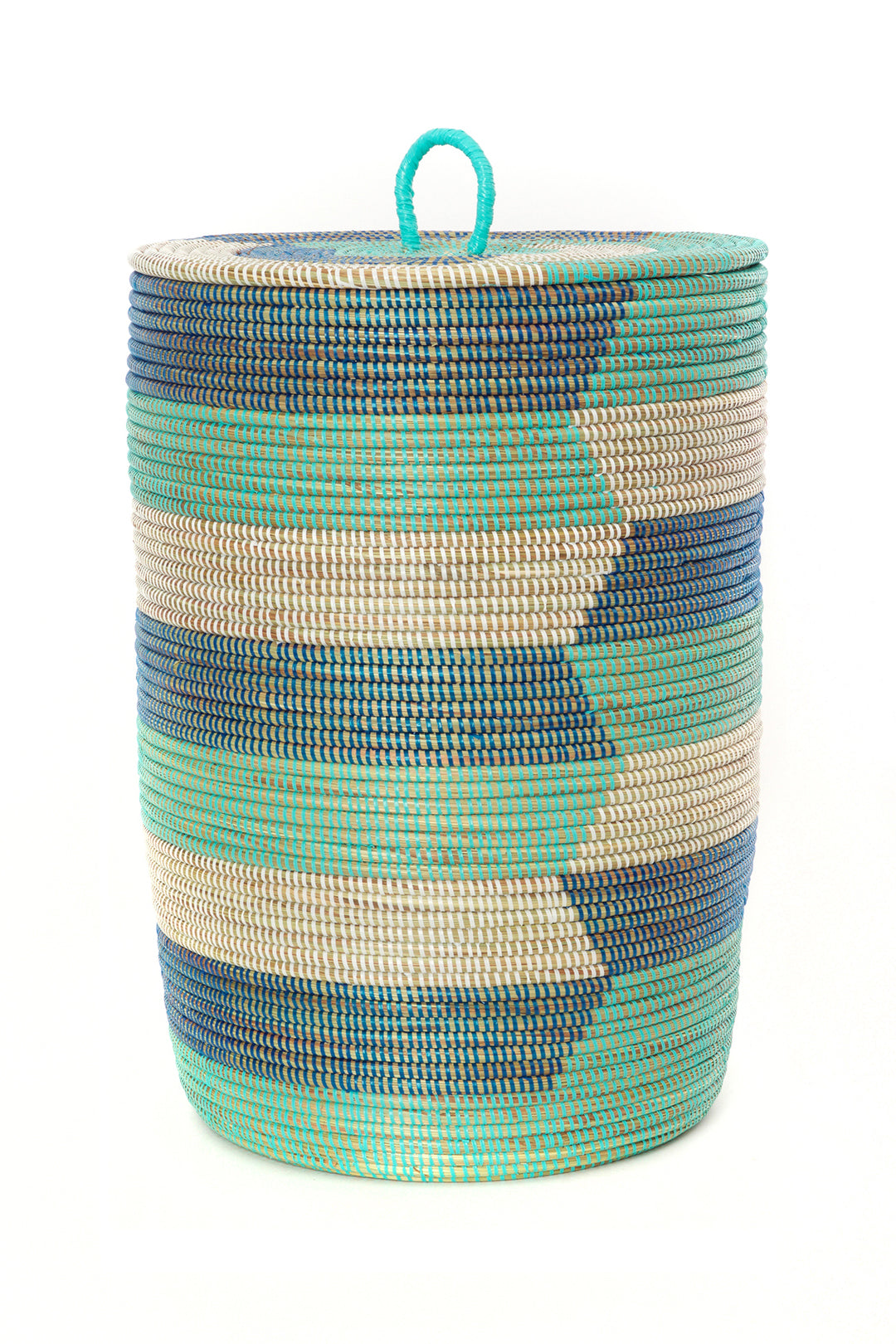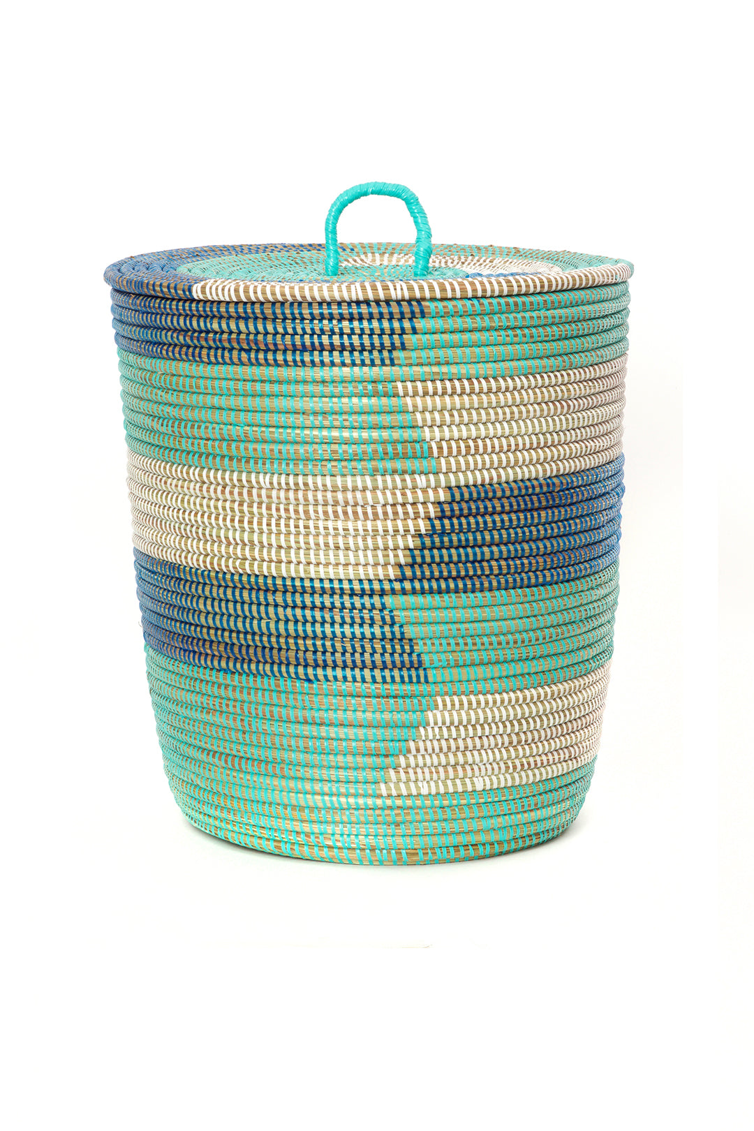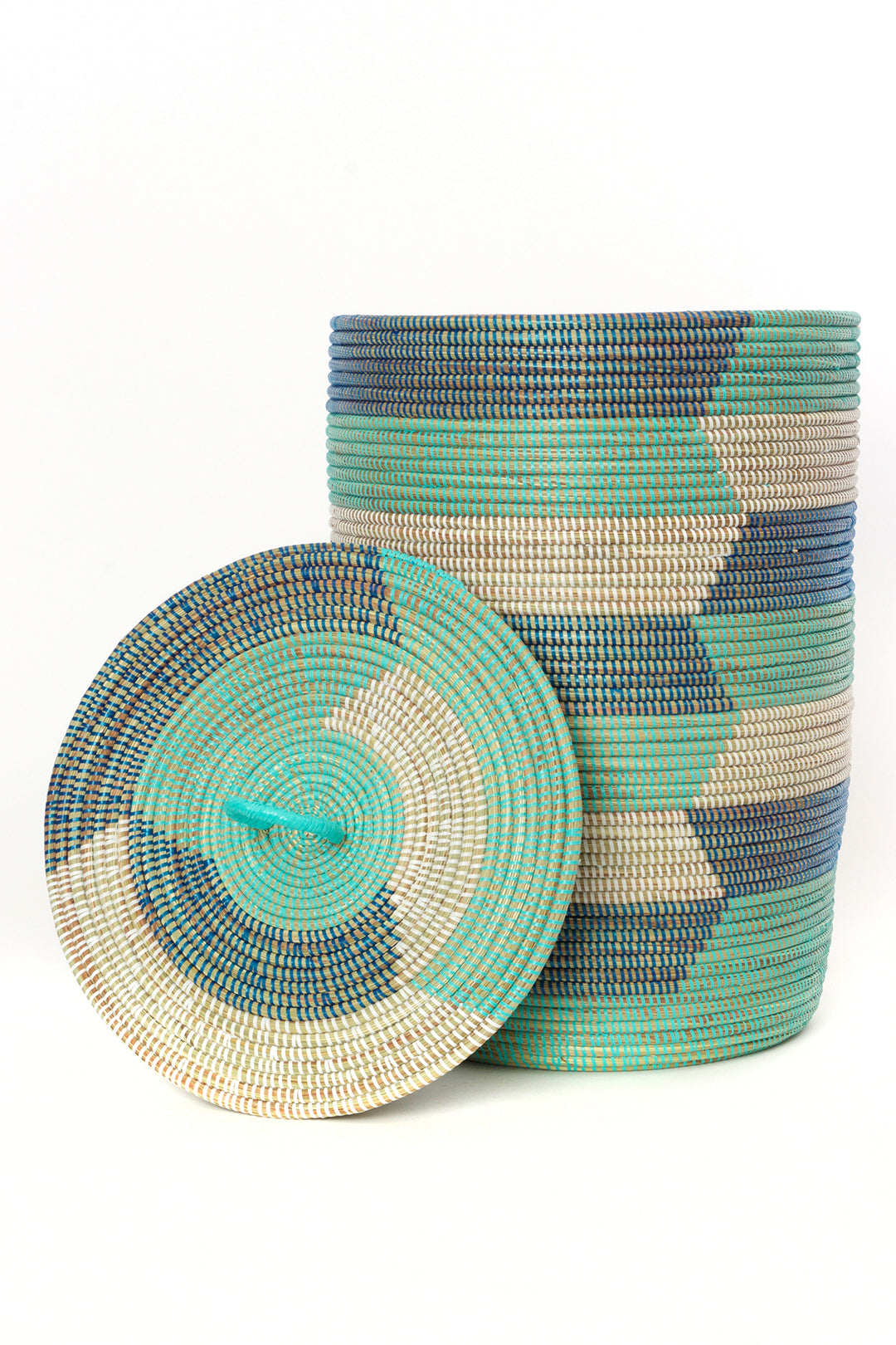 This pared-down set of handcrafted baskets features three nesting sizes in shades of dark blue, aqua blue and white. Each basket is carefully handmade by a talented Wolof woman in rural Senegal.