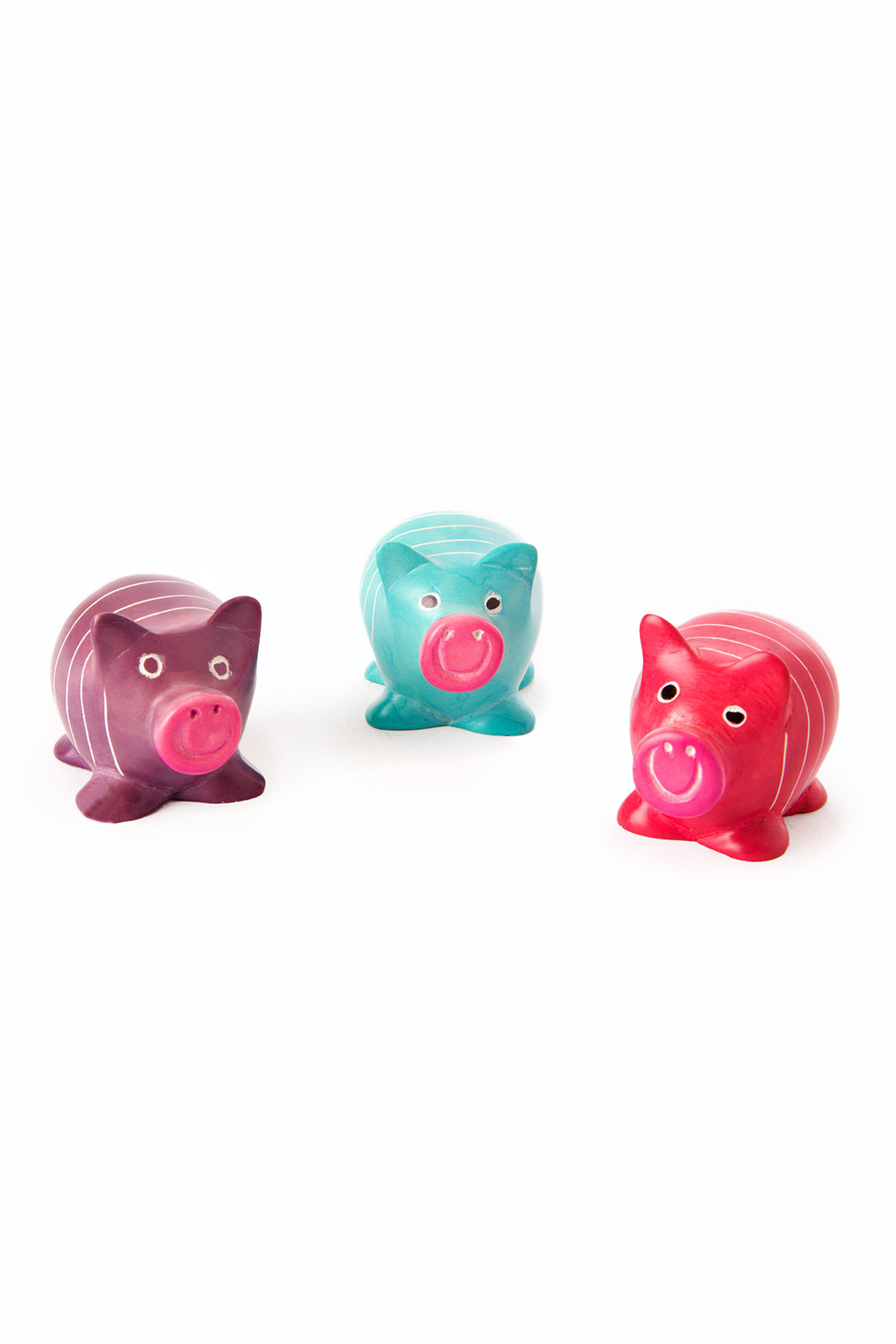 Kenyan artisans hand carve sweet little pig keepsakes from soft soapstone, then hand dye each piece in shades of purple, red, and aqua. Pink noses, etched details, and swirly tails add some serious cuteness.