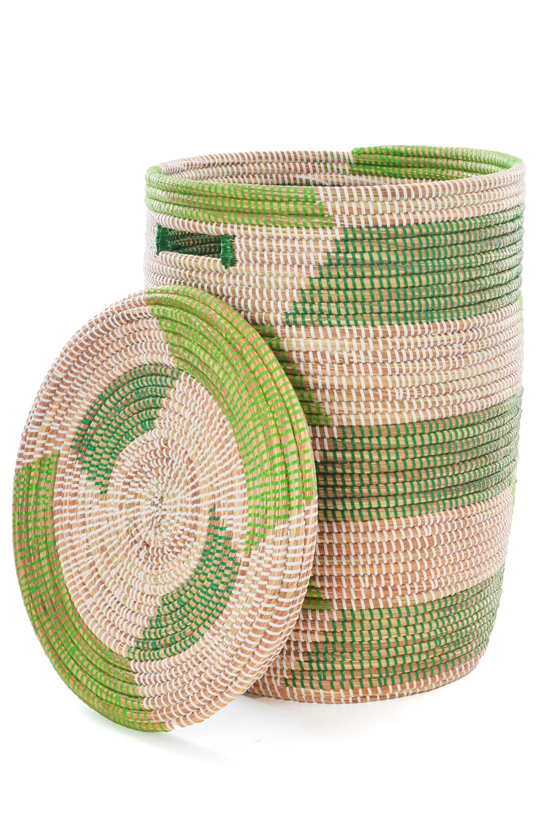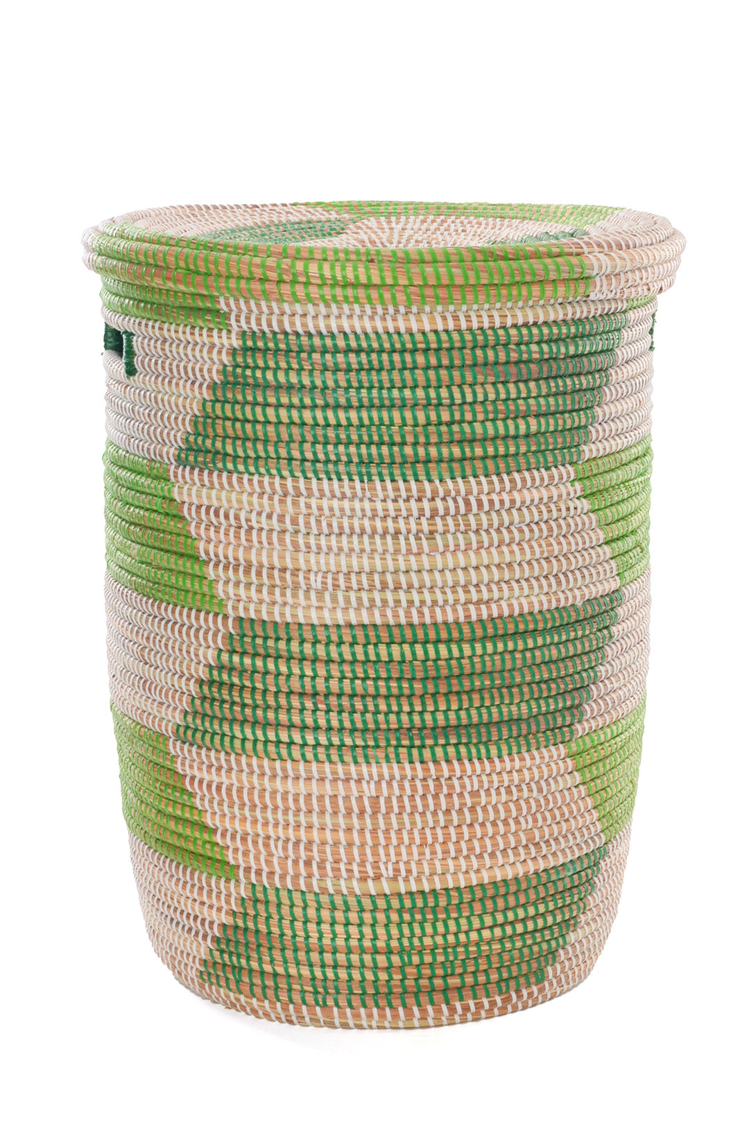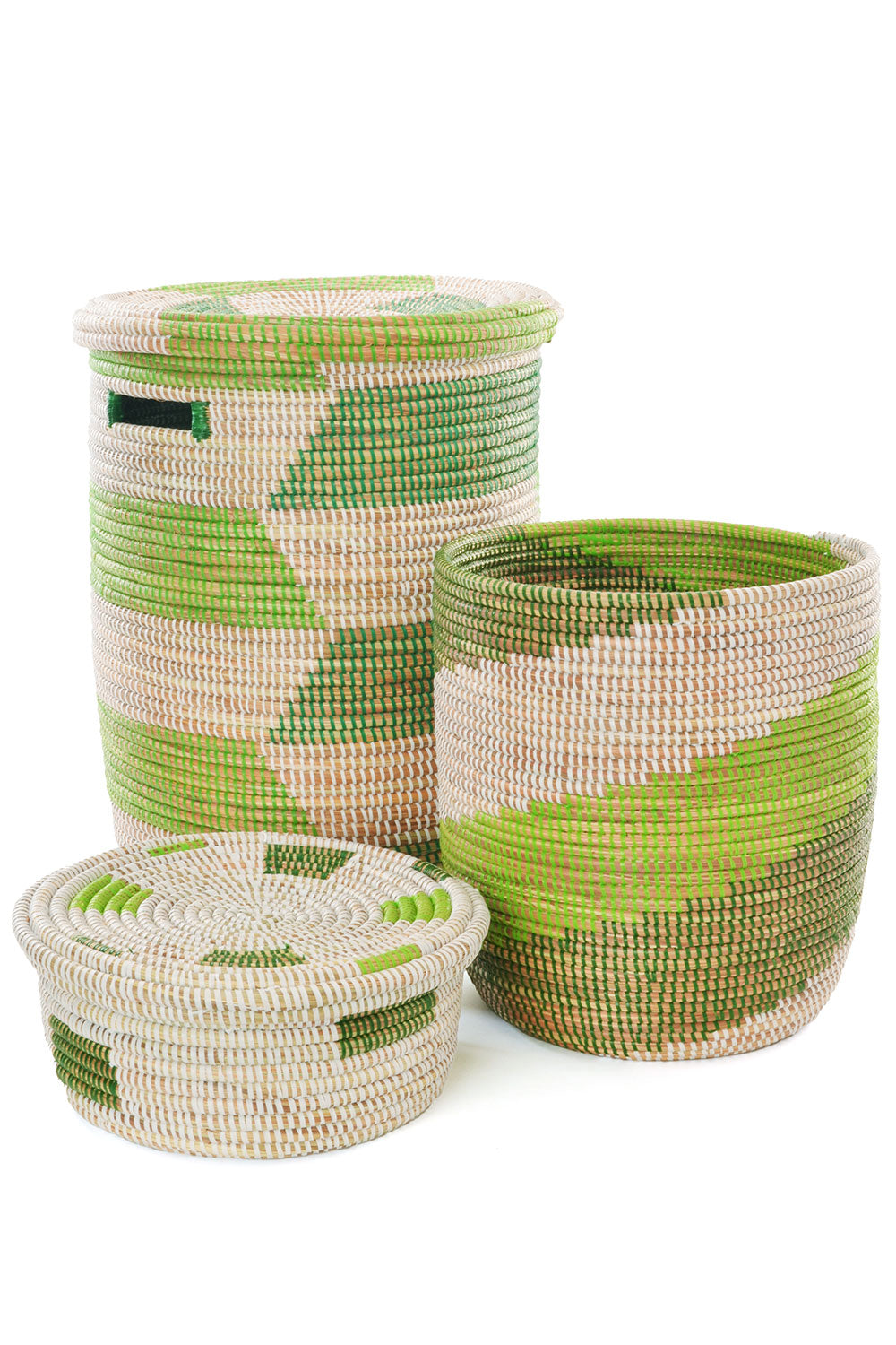 This set of handcrafted baskets features three of our favorite styles (the iconic Peace Corps hamper, open top bin, and small round storage basket) in lime, green and white.