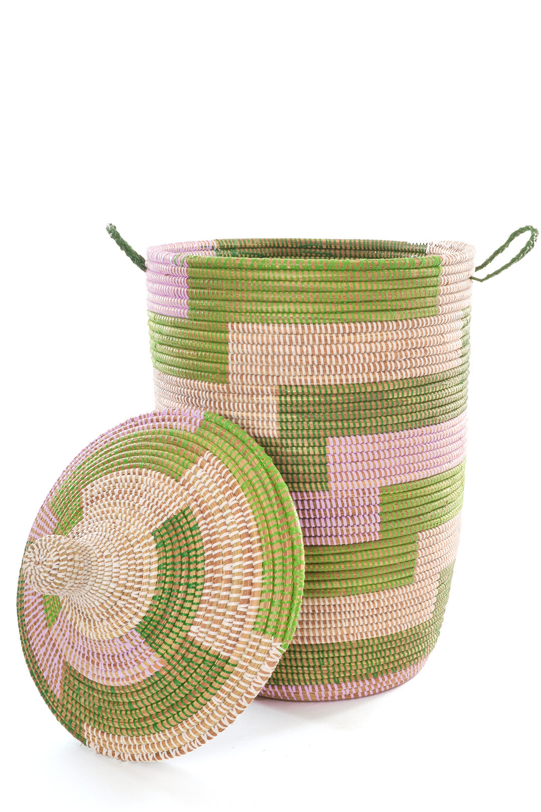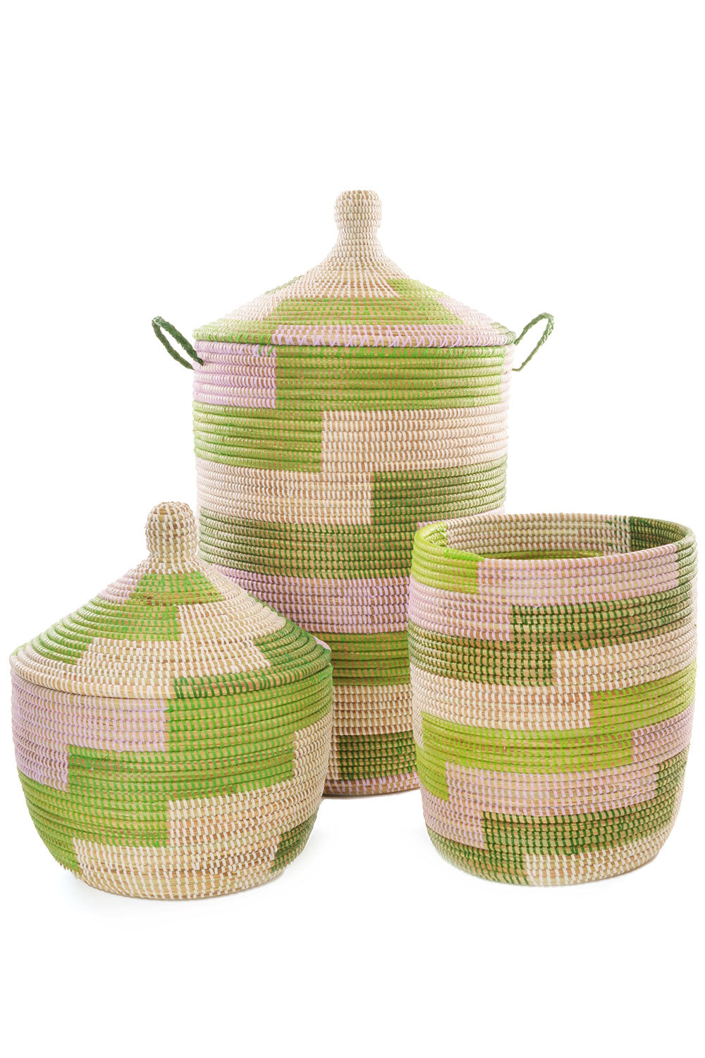 This set of handcrafted baskets features three of our favorite styles (the lidded hamper, open top bin, and lidded warming basket) in a lavender, green and white stair-step pattern.