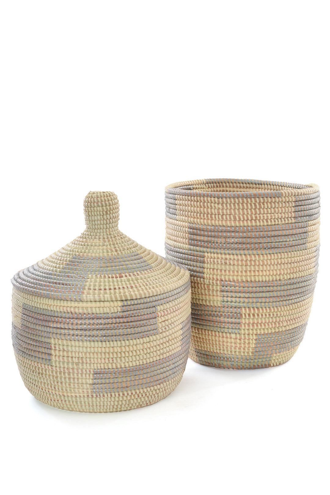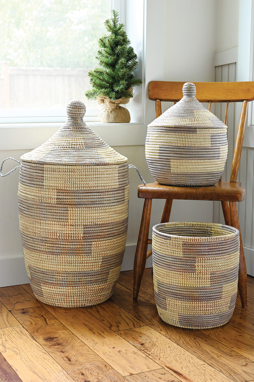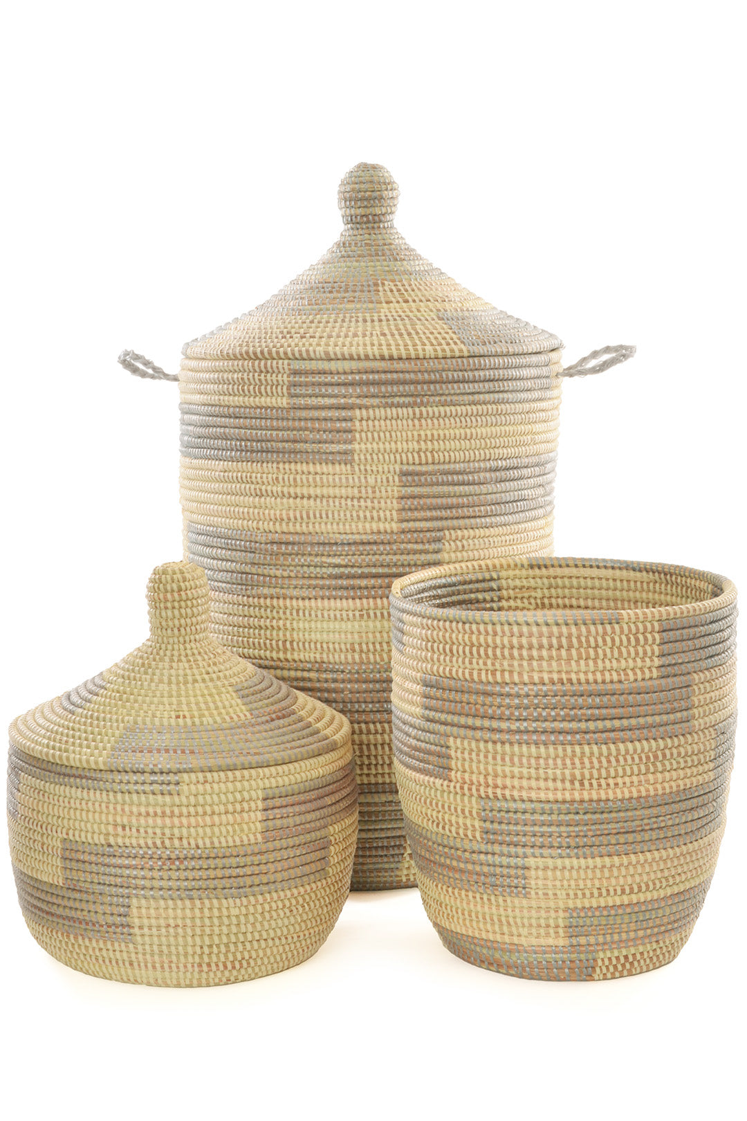 This set of handcrafted baskets features three of our favorite styles (the lidded hamper, open top bin, and lidded warming basket) in a silver & cream stair-step pattern.