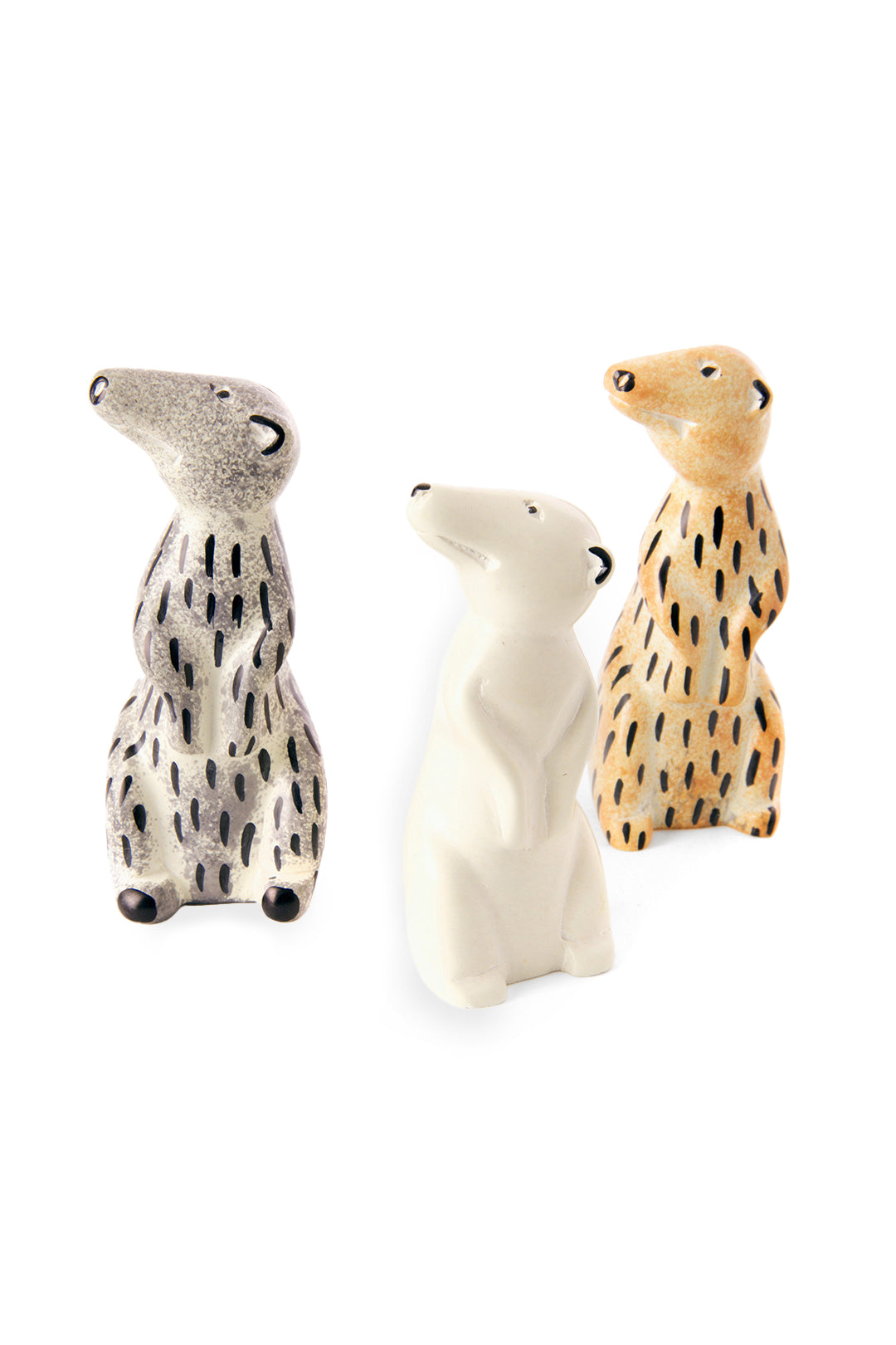 Kenyan artisans hand carve meerkat keepsakes from soft soapstone, then hand dye each piece in neutral shades of white, brown, and gray. Sculpted in their famed upright pose with the cutest curious expression. These make a lovely gift for safari enthusiasts or meerkat lovers of all ages.