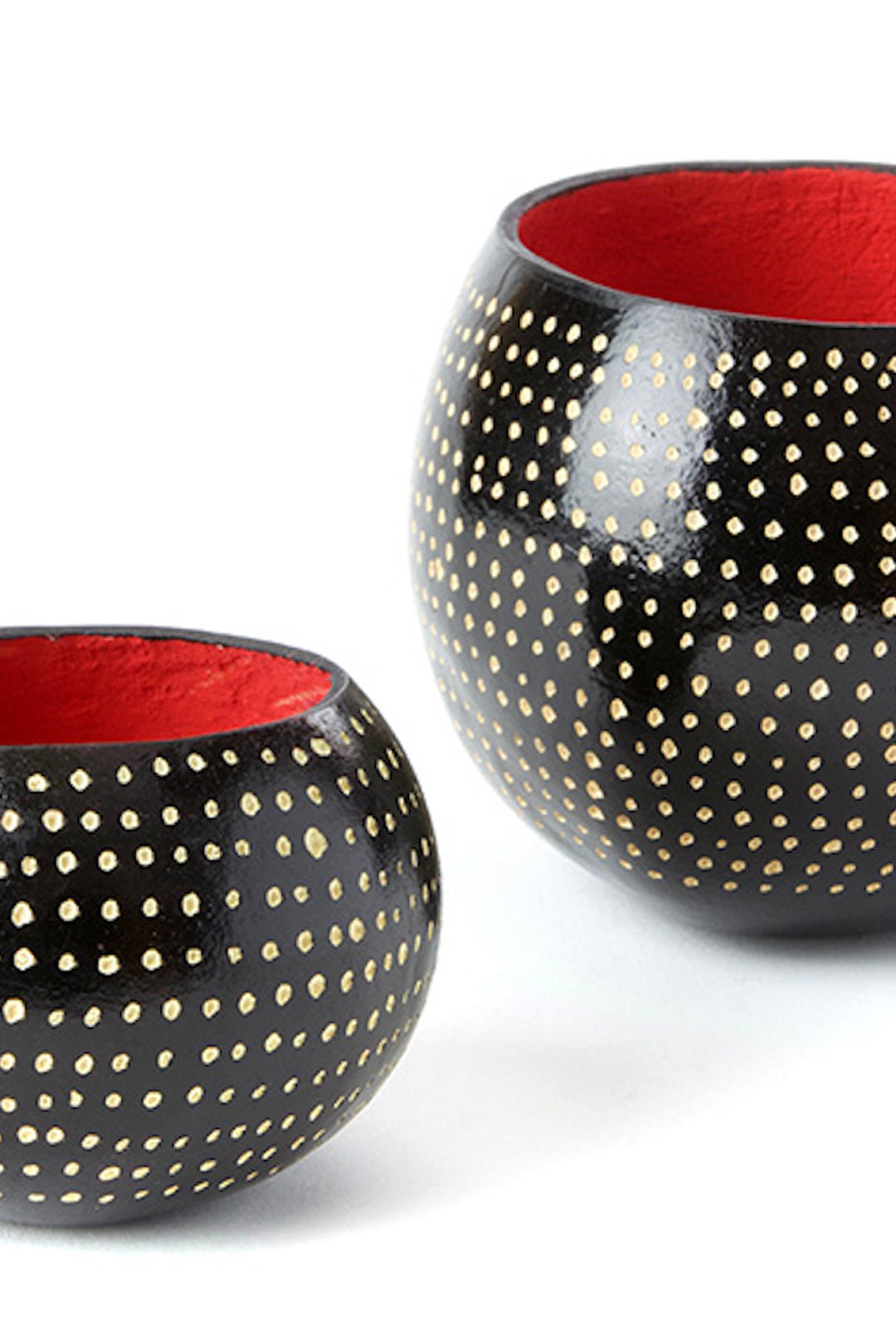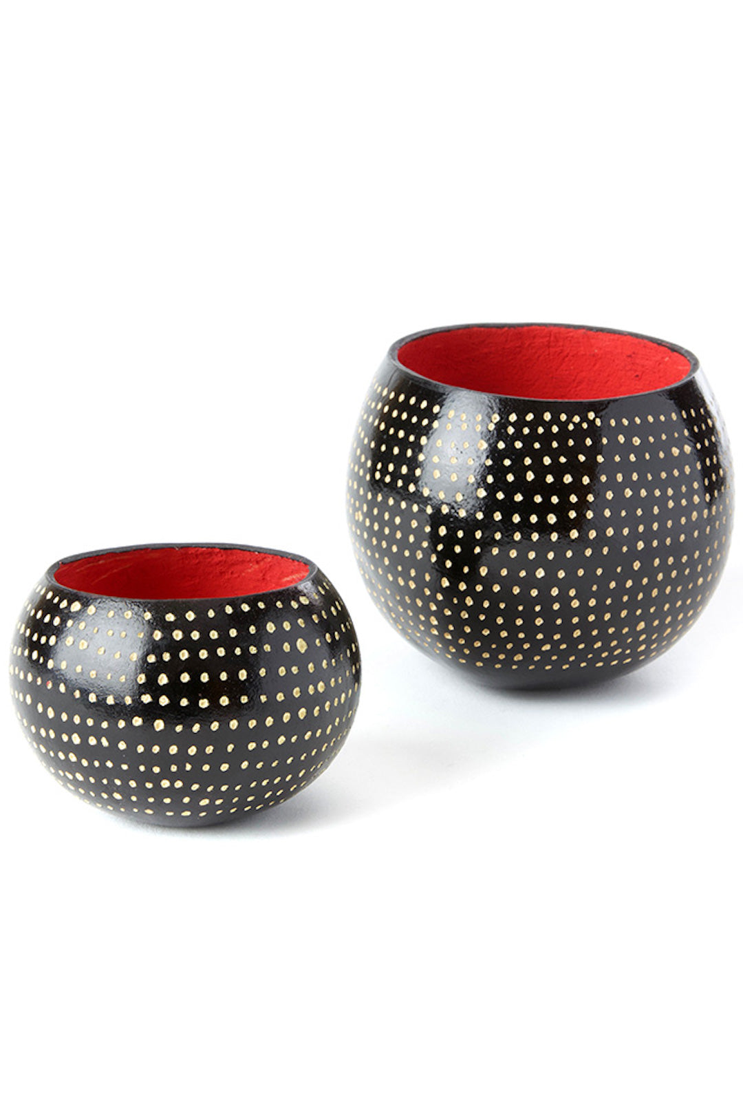 Kenyan artisans create stylish desktop storage vessels from dried calabash gourds, which grow abundantly in the Kenyan countryside. Each cup is dyed a deep black, then etched with small dots to resemble the feathers of a guinea hen.