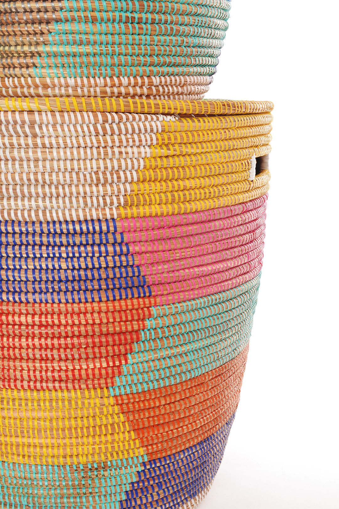 This fun and functional set of handcrafted baskets features two nesting sizes in a rainbow herringbone pattern. Each basket is carefully handmade by a talented Wolof woman in rural Senegal, and features cut-out handles and a flat lid.