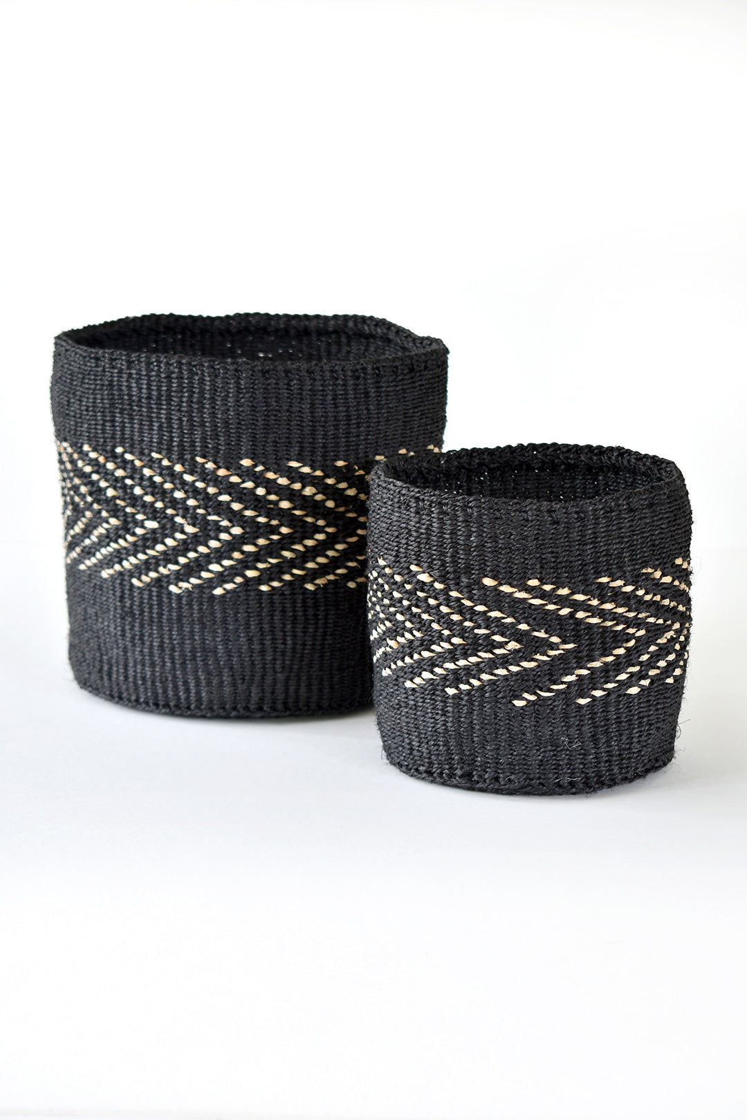 This versatile set of nesting baskets is handwoven by talented rural Kenyan women using strands of hand-dyed sisal and banana fiber. These rustic natural fiber baskets feature bold contrast between rough sisal and earthy, variegated banana leaf fiber.