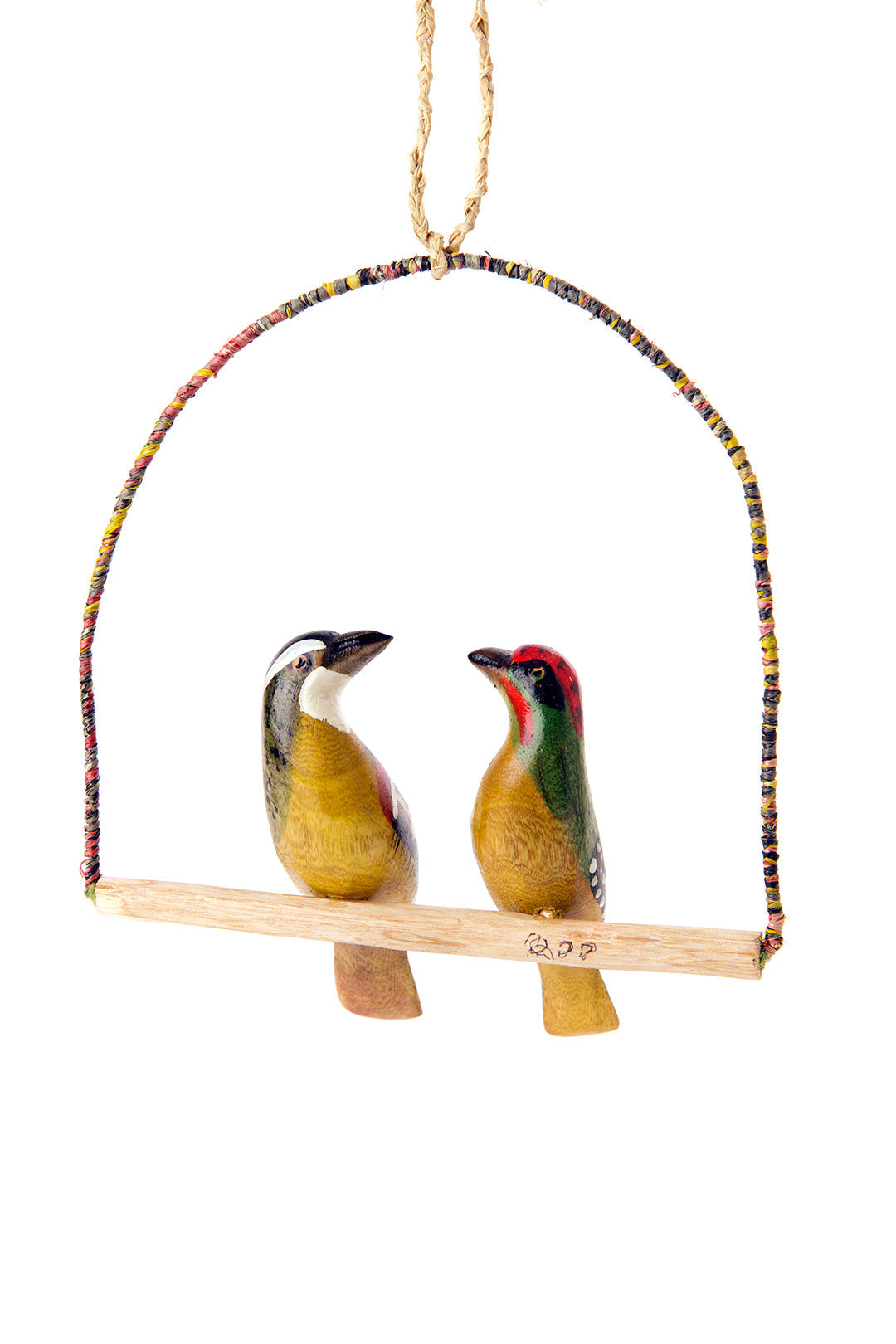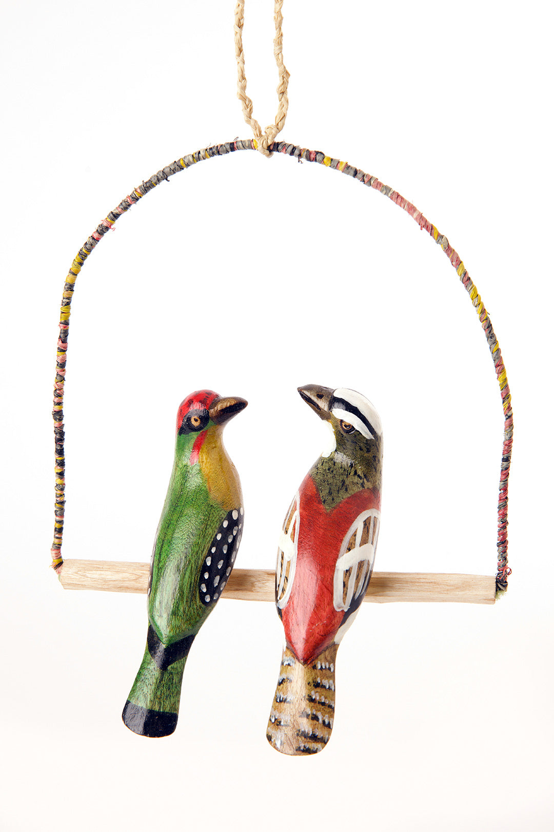 Kamau is a talented carver and painter who specializes in bird art. His swinging bird decoration makes a cheerful addition to the home. A pair of assorted birds adorn the jacaranda branch seat of the raffia-wrapped wire swing.