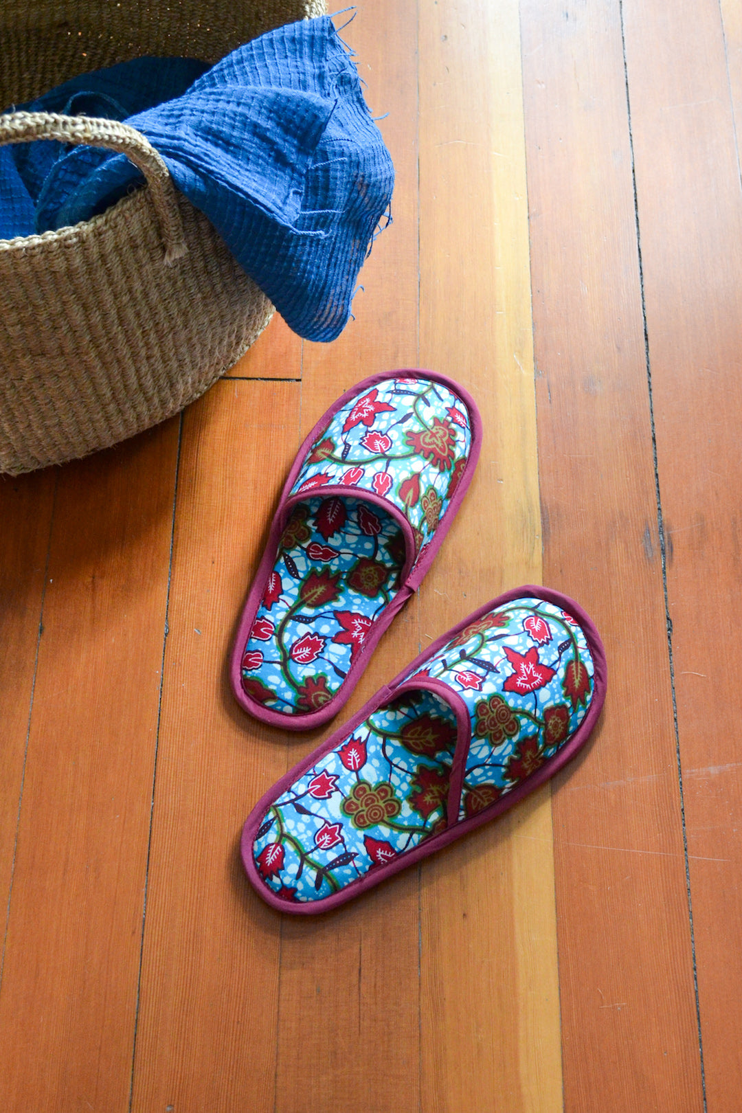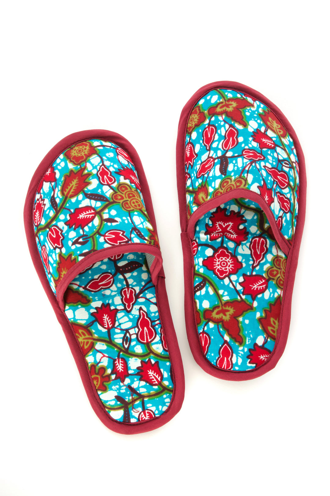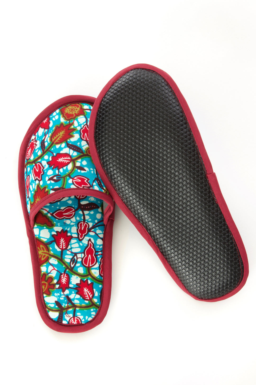 Ghanaian artisans put fun ankara wax cloth to work as comfy slippers. With a foam footbed, anti-slip bottom and contrasting trim, these sweet slippers showcase the brilliant colors and patterns of African wax cloth.