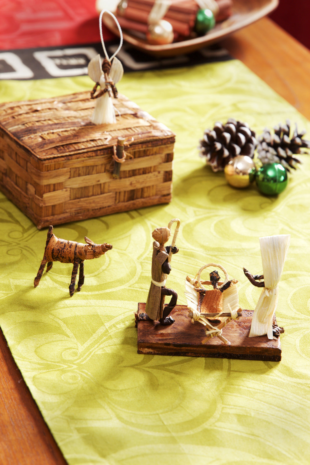 Our simplified banana fiber nativity scene features the holy family, one animal, and an angel. The set is presented in a beautiful handcrafted banana fiber storage box.