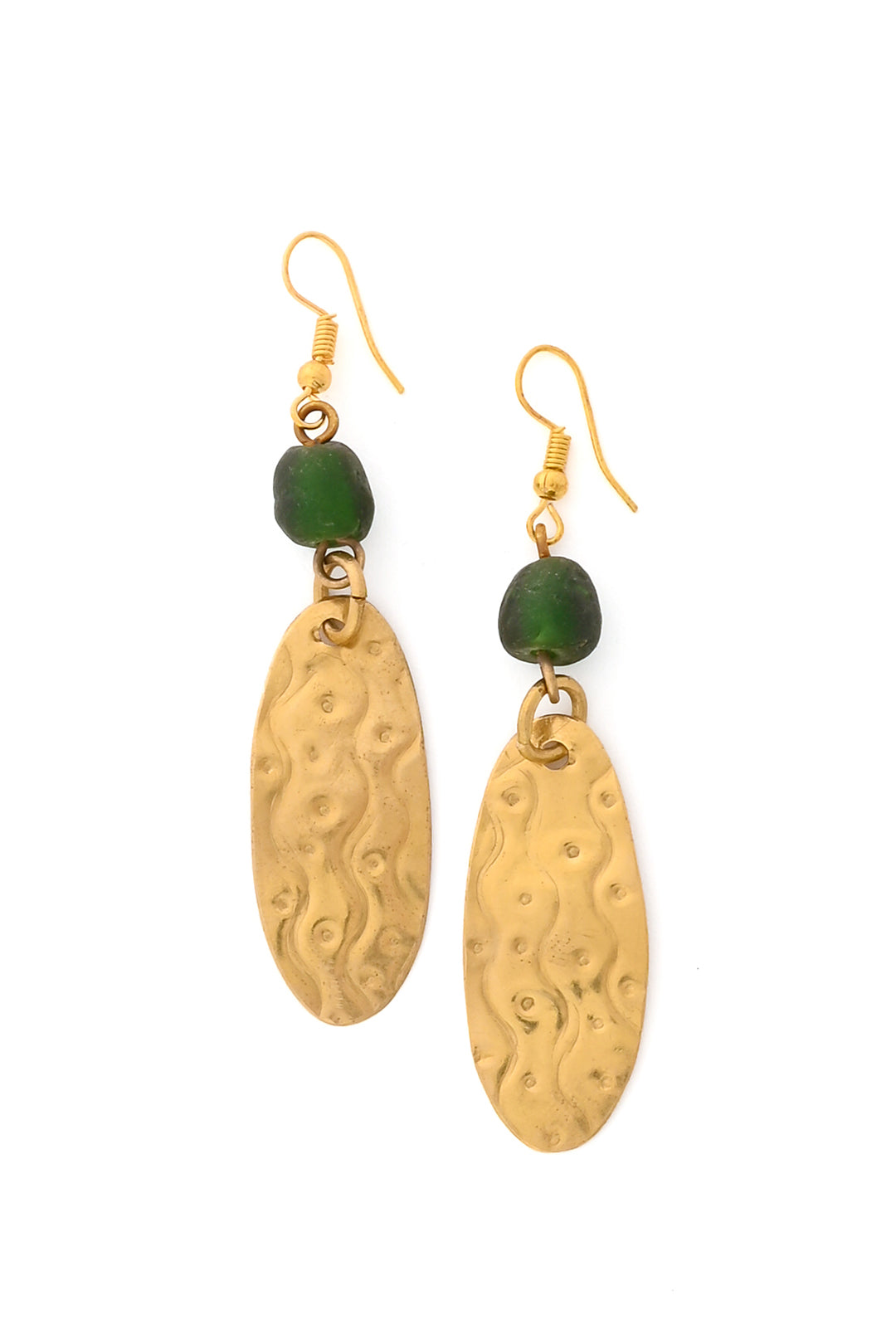 Handmade by Kenyan artisans, these earrings feature a recycled glass bead in a beautiful shade of green. Brass links connect it to an oval brass pendant stamped with geometric detail.