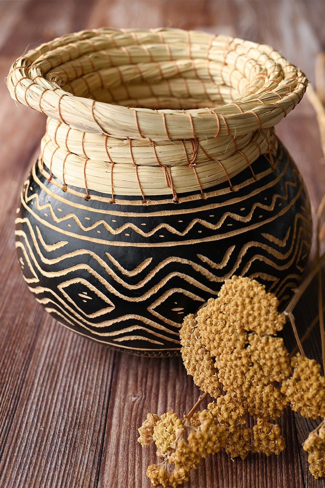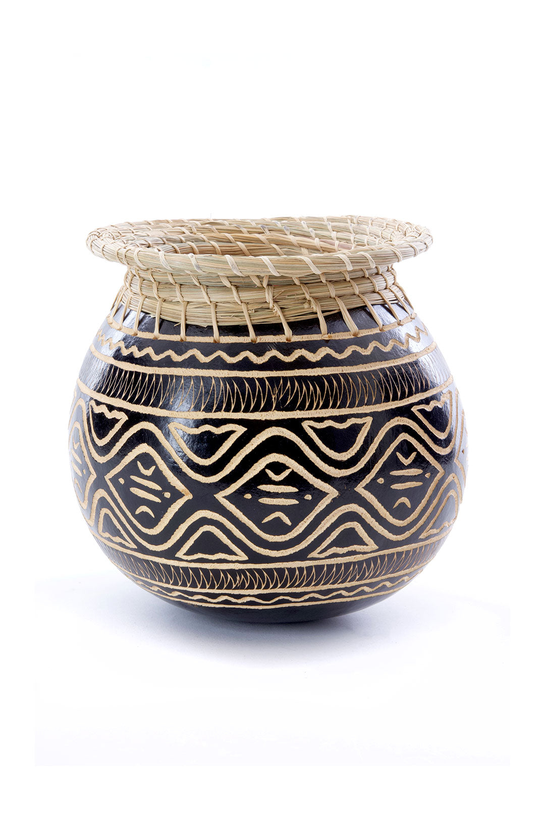 Small Carved Calabash Gourd Vessel with Basketry Rim