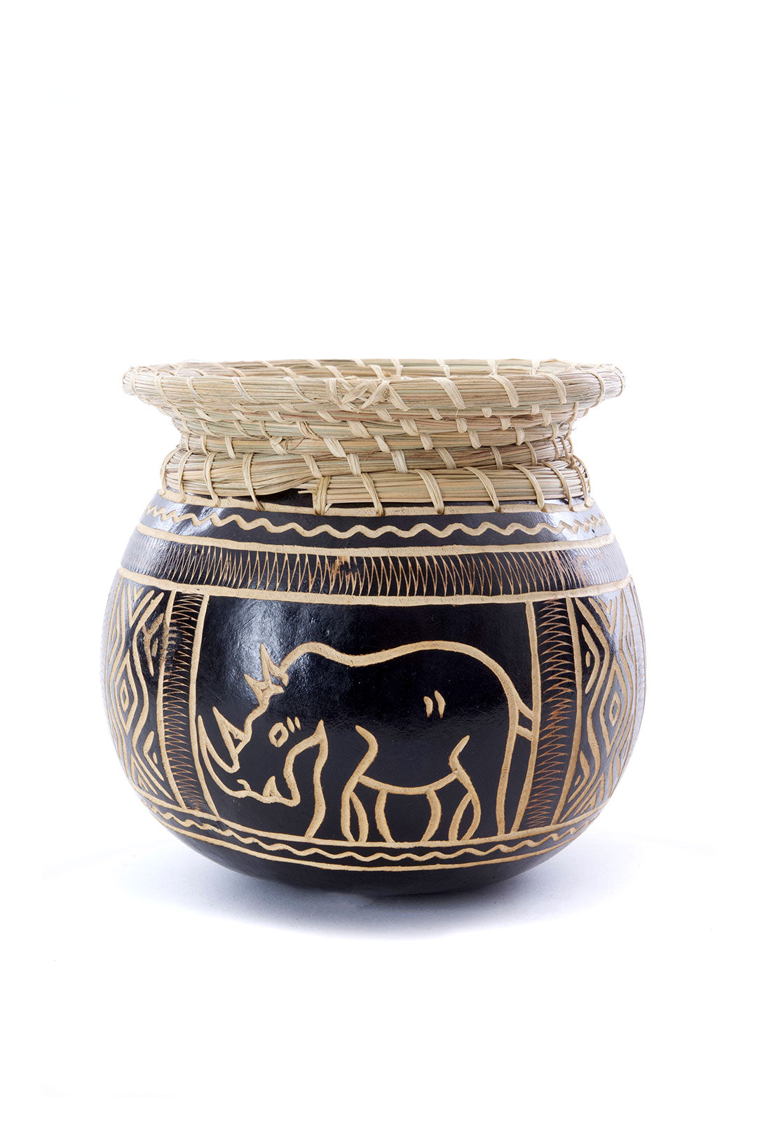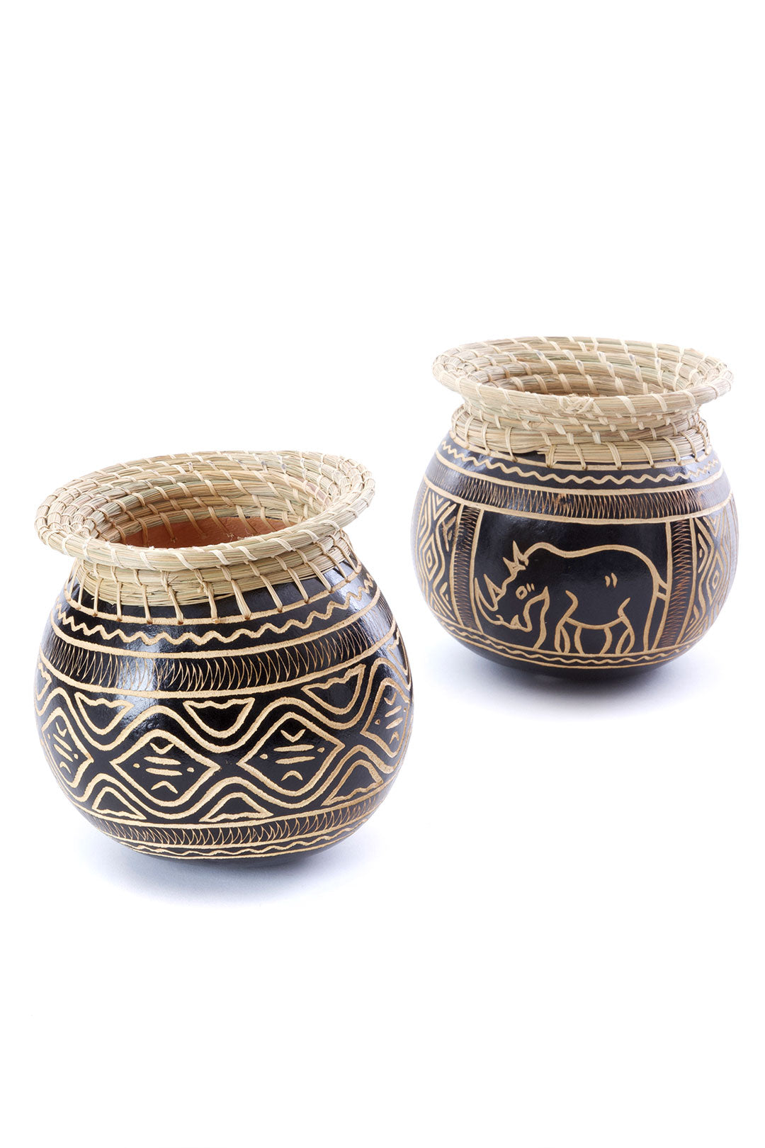 Kenyan artisans create stylish desktop storage vessels from dried calabash gourds, which grow abundantly in the Kenyan countryside. Each cup is dyed to an earthy brown hue, then etched with assorted safari-inspired designs. Woven natural fiber adorns the top of the vessel.