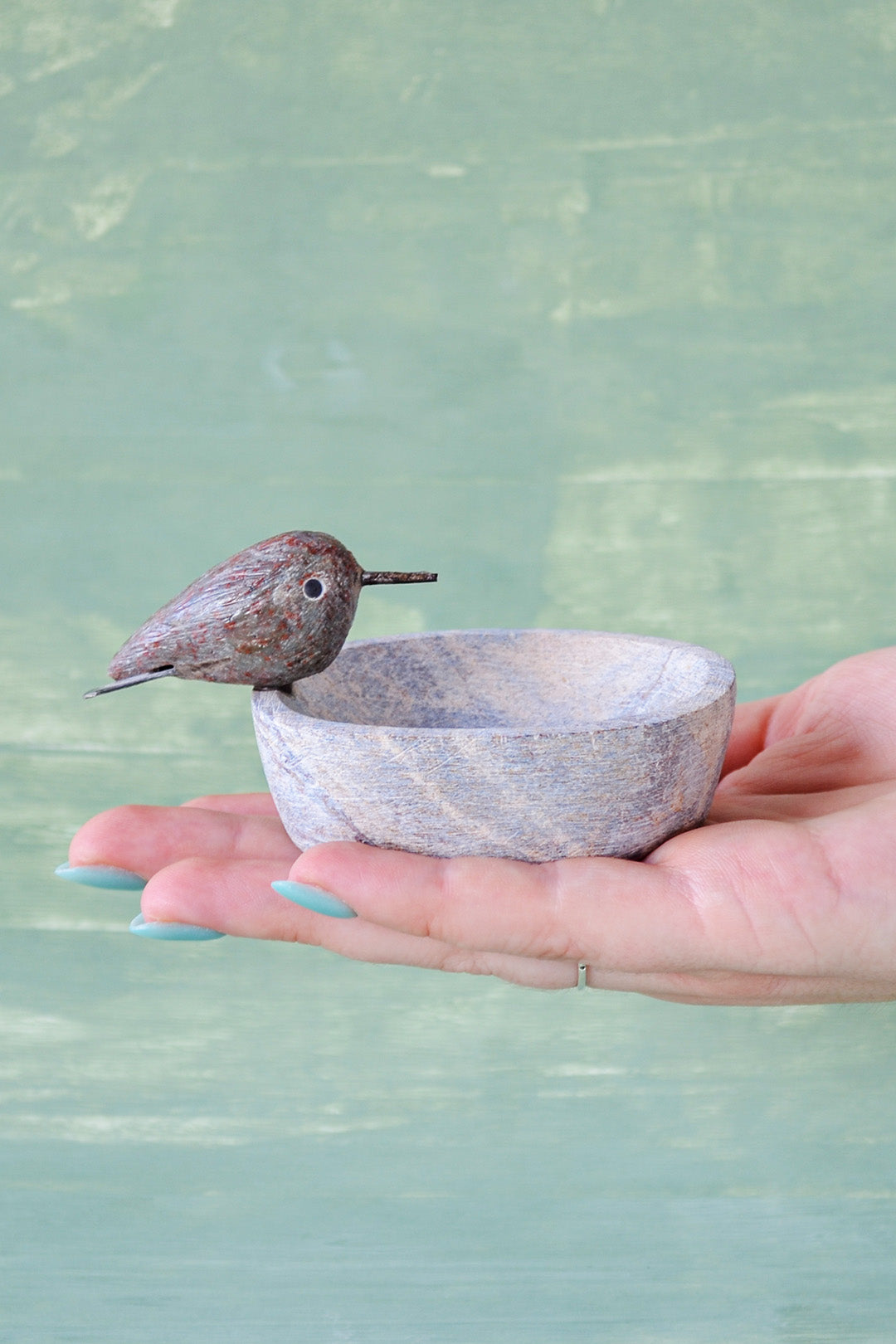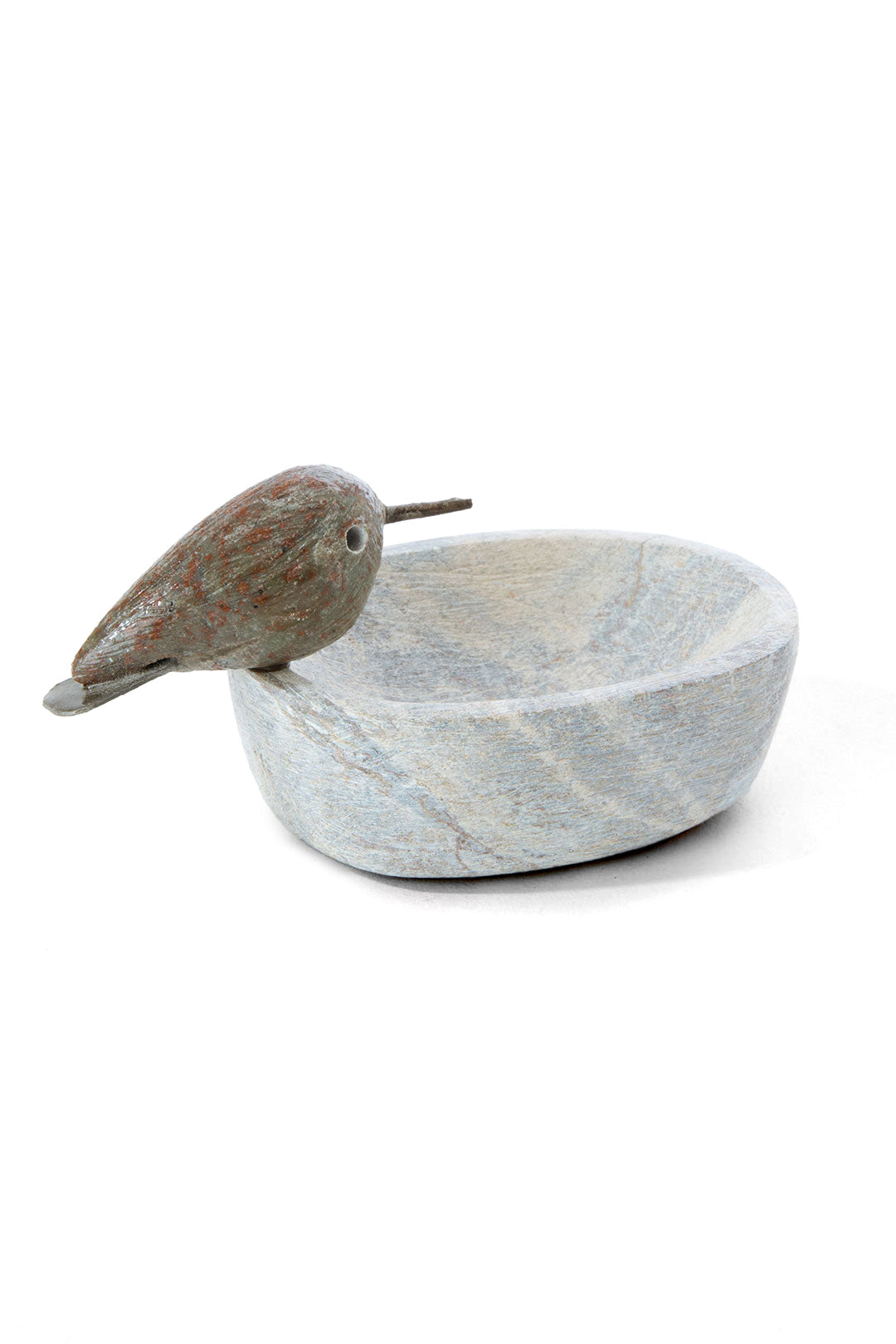A talented stone sculptor named Luke Jimu carves these beautiful dishes from serpentine stone. A small polished bird perches on the edge of each rough-hewn oval bowl.