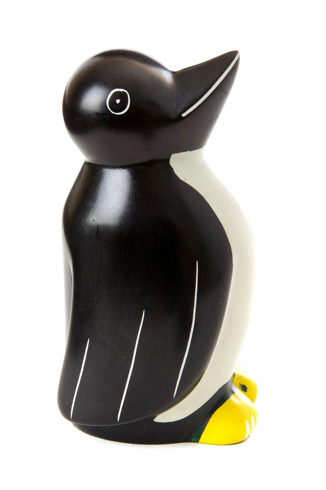 Kenyan artisans excel at carving soapstone into a variety of shapes, including this adorable little penguin. A dyed black coat and cute yellow feet adorn the sculpture.