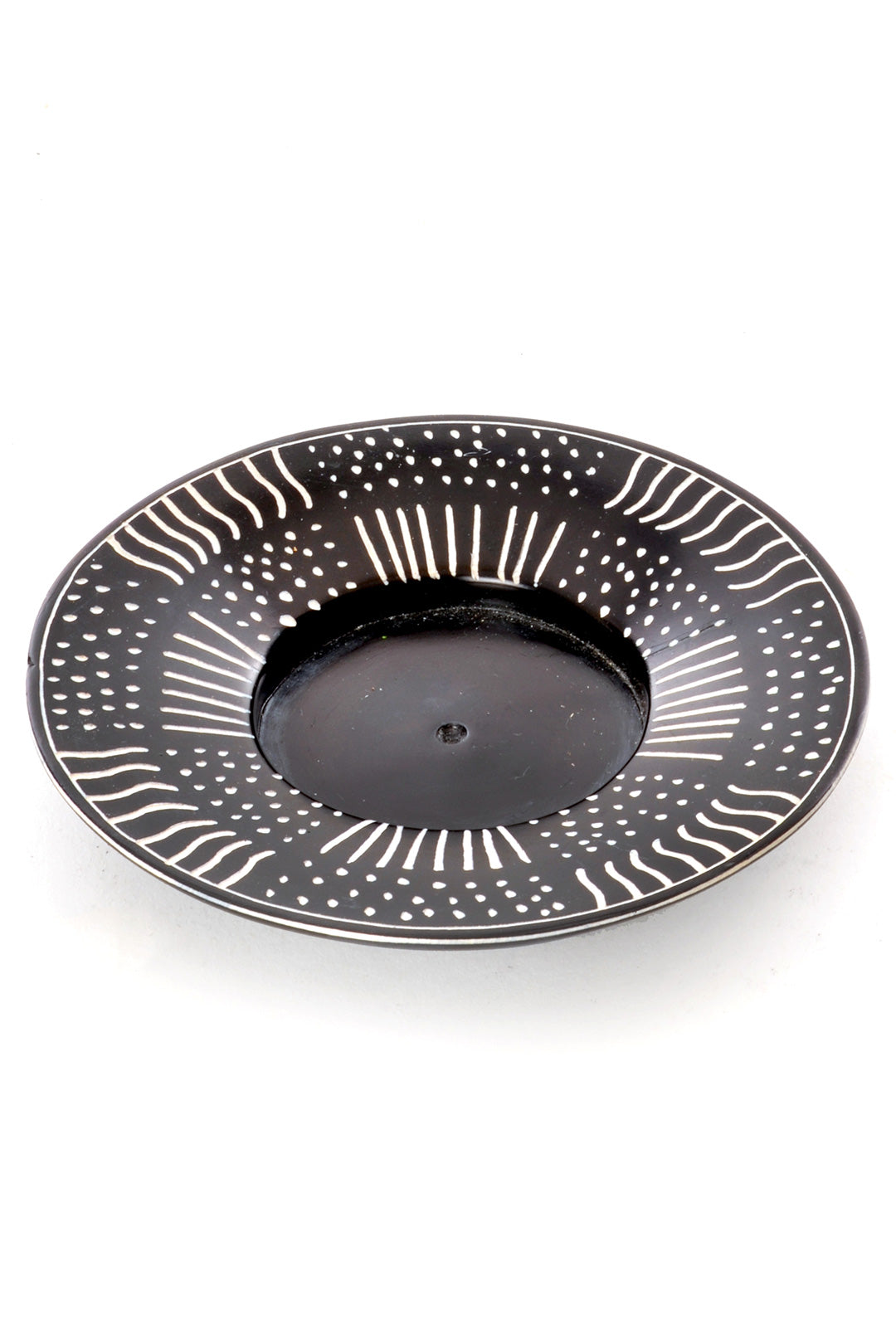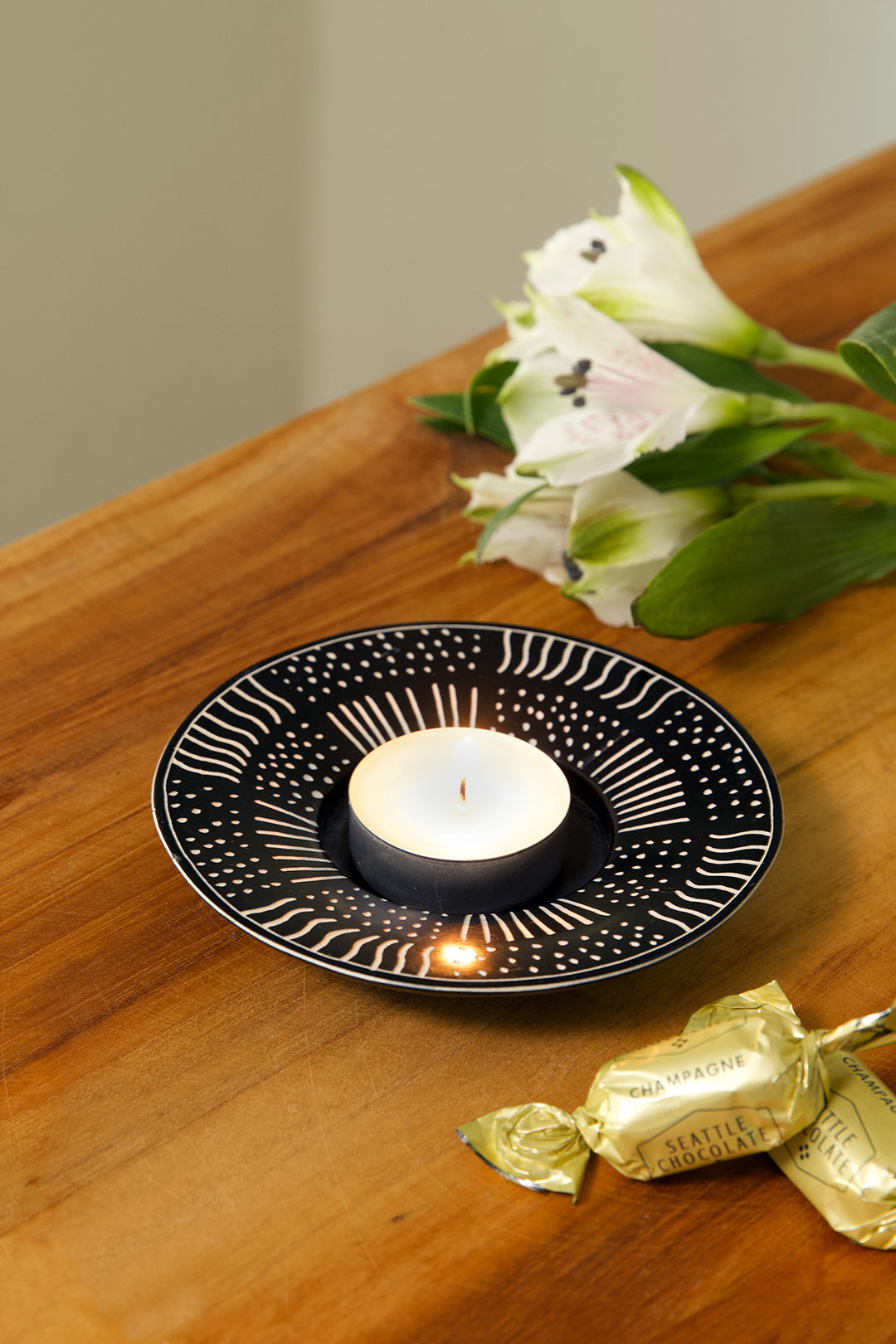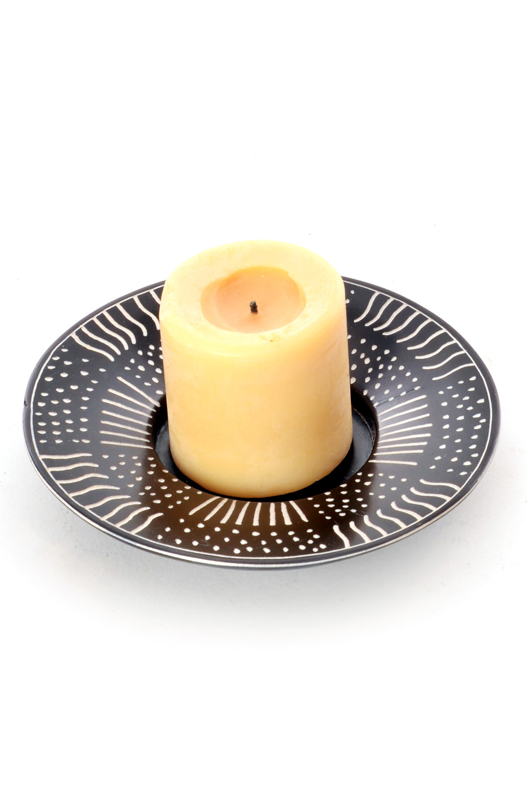 Carvers in Kenya's western highlands craft the basic form for simple candle holder dish from soft soapstone. Artisans in a Nairobi workshop then add a chic black dyed finish and etched details inspired by the intricate high-contrast designs of Malian mudcloth.