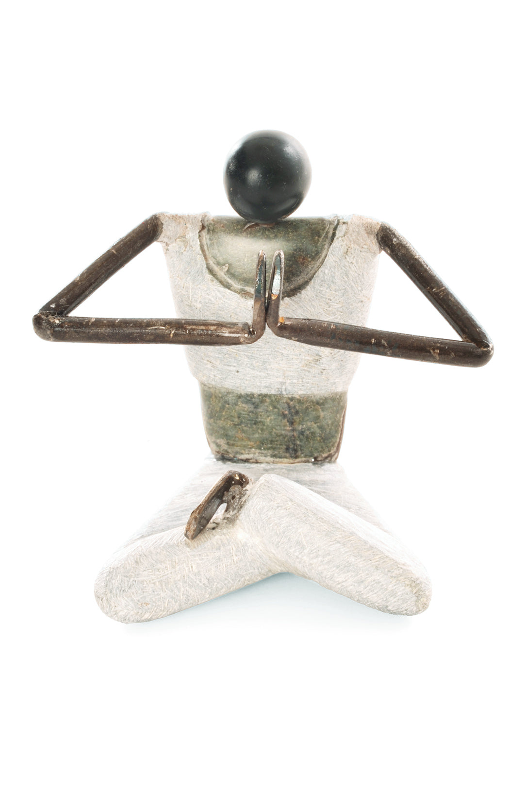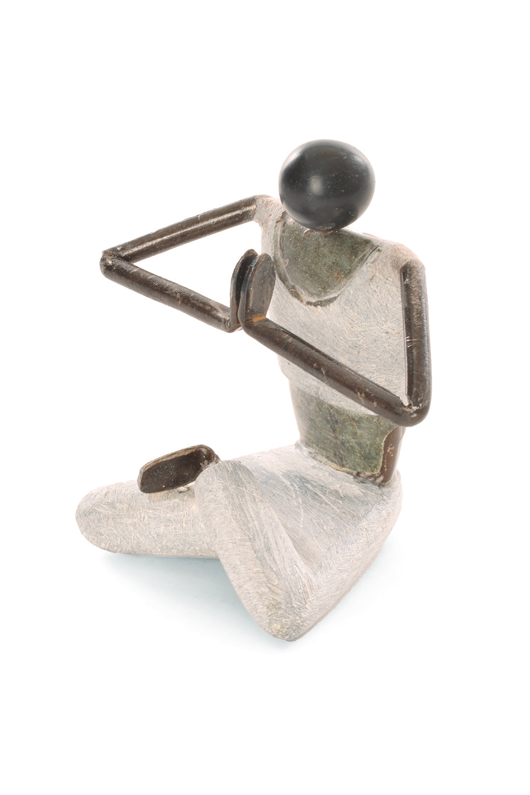 Zimbabwean artist Luke Jimu combines textured pale serpentine stone and recycled metal to portray scenes of every-day life. With legs crossed and hands folded at the heart chakra, this serene yogi sculpture celebrates the beauty of yoga.