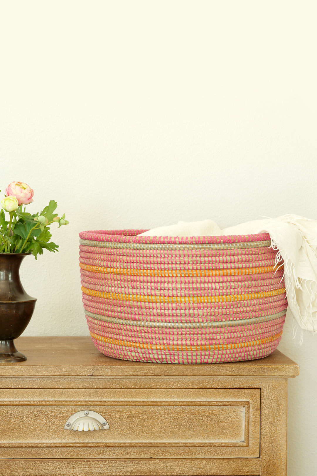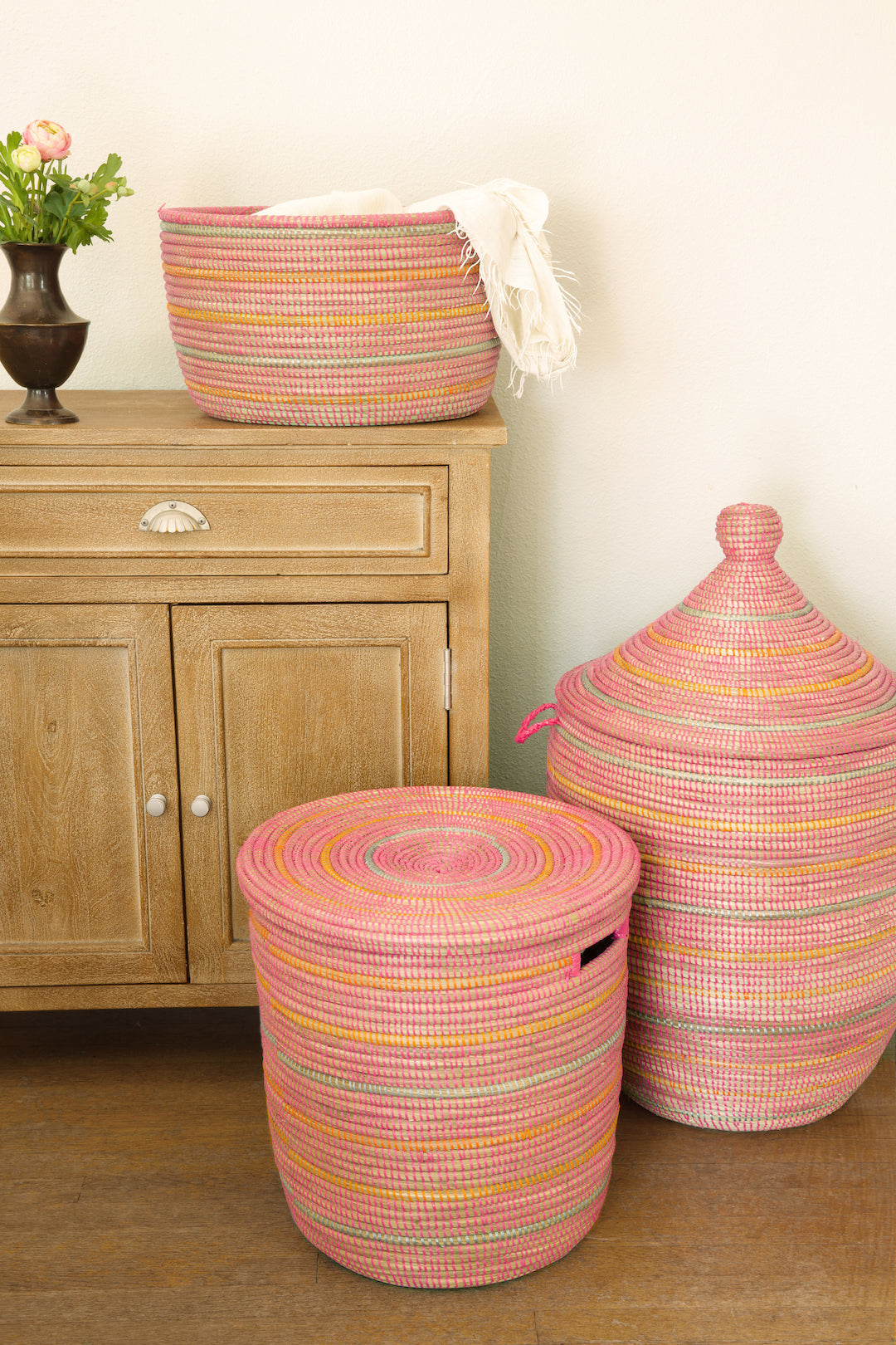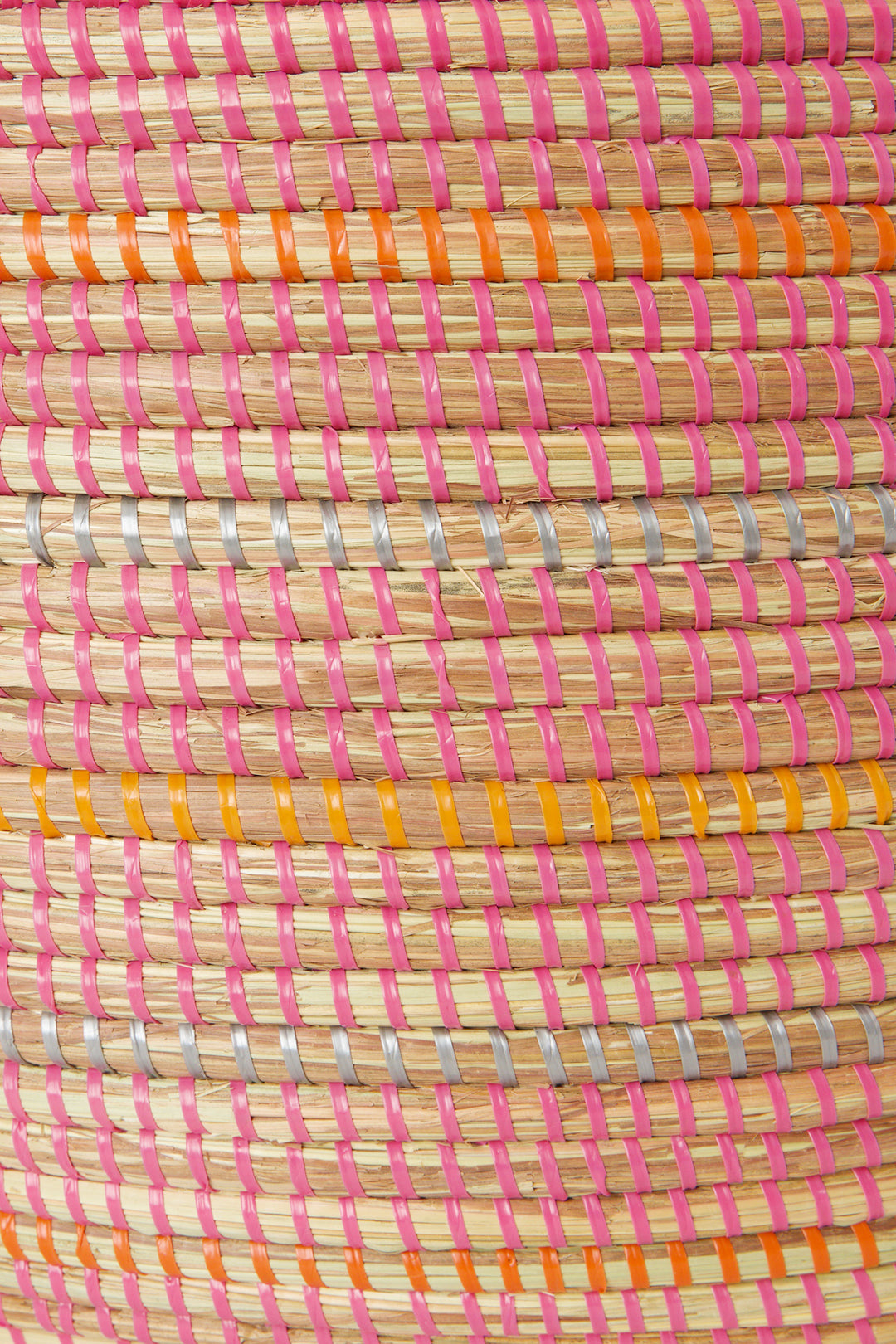 Wolof women in rural Senegal utilize salvaged plastic strips and abundant dried cattail stalks to create these incredibly handy oval storage baskets. A perfect way to blend storage and art, in any room of the home, each basket features stripes in silver and orange against a pink background.