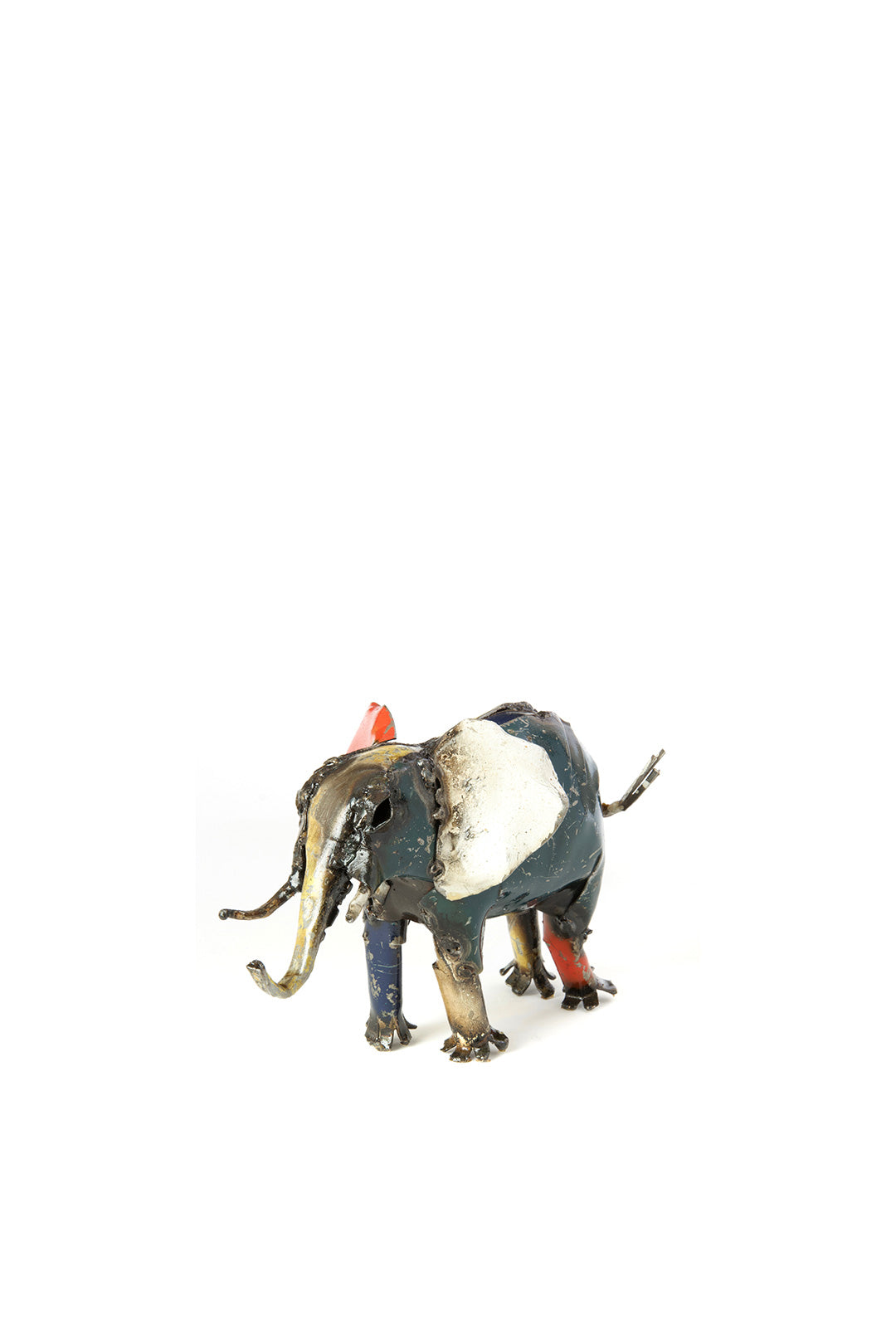 At Tonderai Metal Works in Zimbabwe, metal sculptors transform colorful red, yellow, white and blue oil drums into fashionable garden art elephant sculptures. Each sculpture is finished with varnish to protect against the elements.