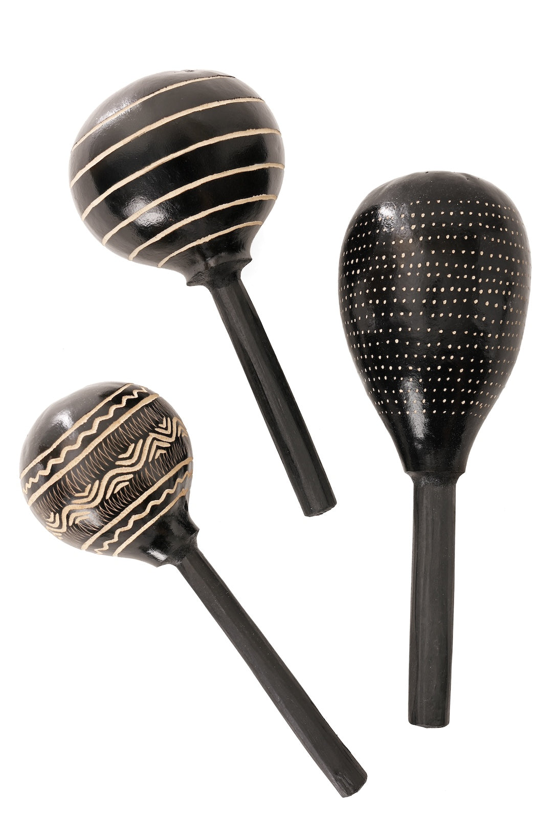Kenyan artisans collect dried calabash gourds, which grow well in Kenya, to create these unique maraca shakers. The gourd and jacaranda handle are dyed black, then the gourd is etched with an assortment of geometric designs.