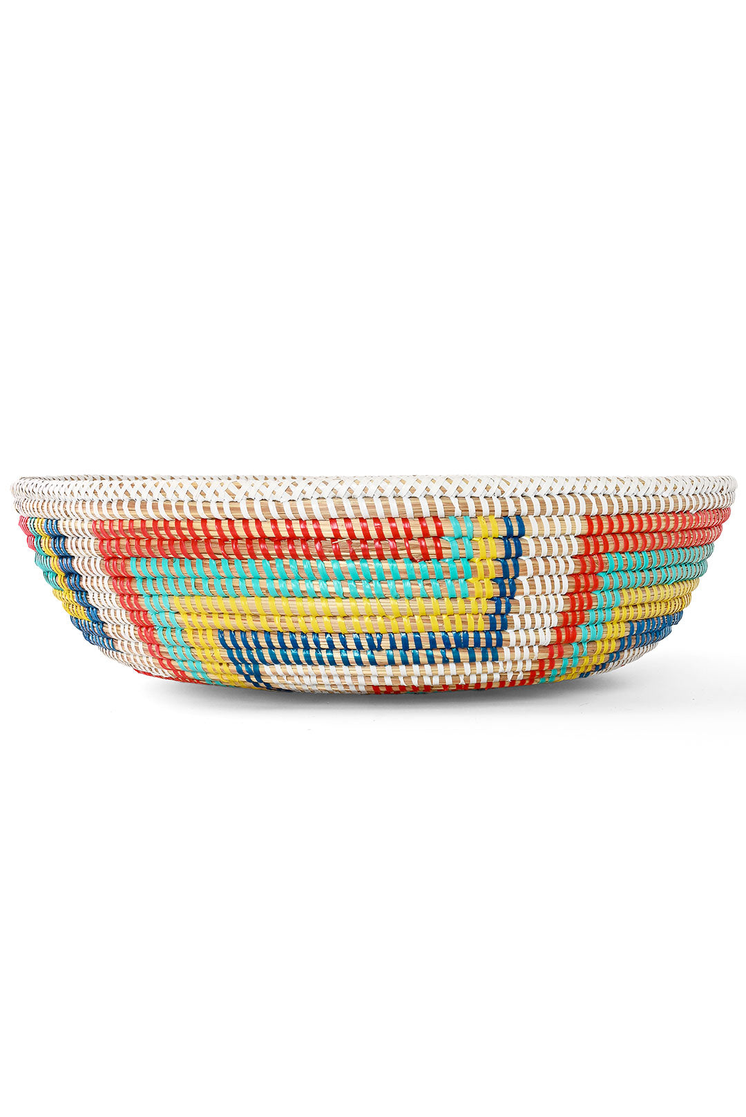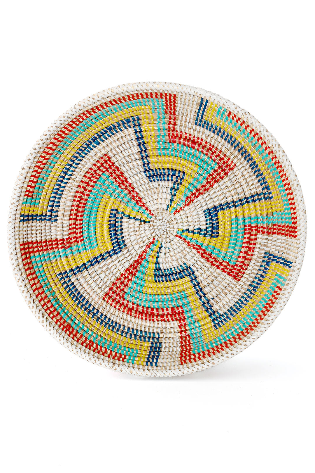 Wolof women in rural Senegal craft these vibrant baskets from cattail stalks and colorful strips of salvaged plastic. A radiating zigzag design makes these tabletop baskets an eye-catching addition to the wall.