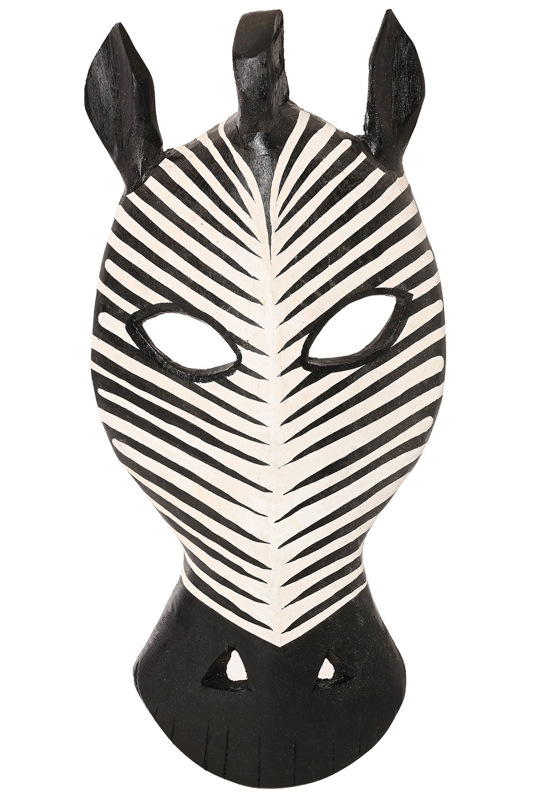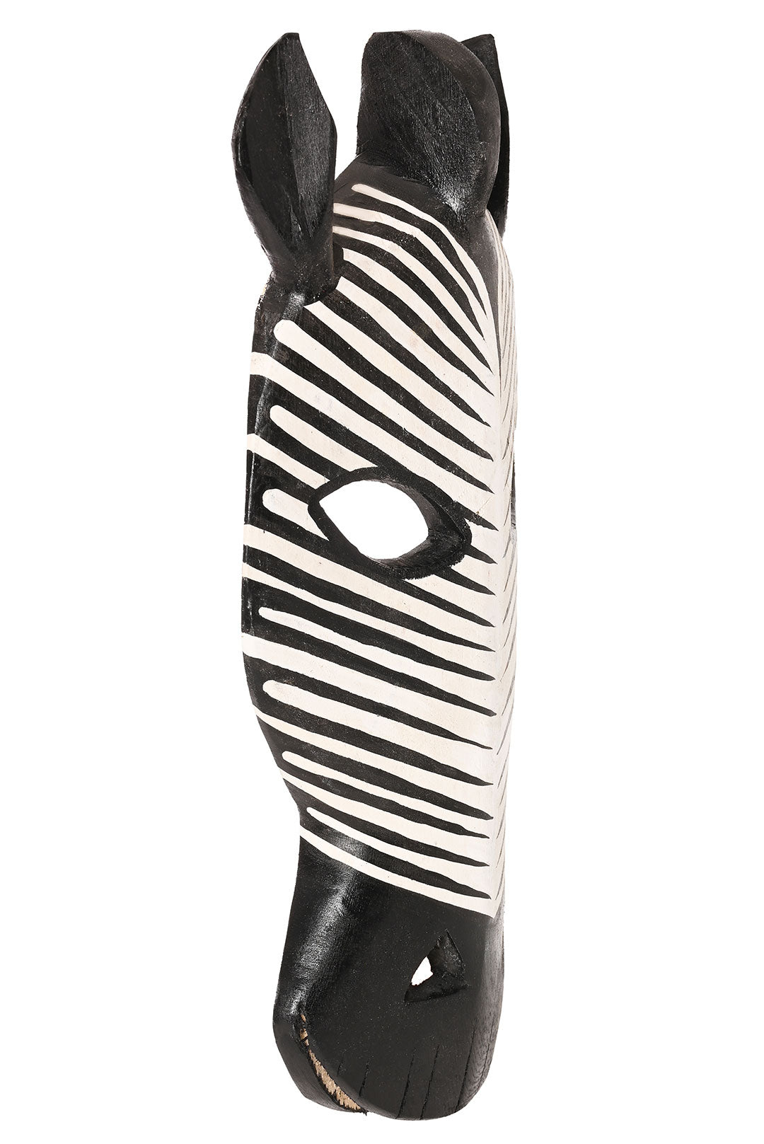Talented Kenyan wood carvers hand carve jacaranda wood into a stylized zebra mask. Bold, angular black and white strips makes this display mask a beautiful addition to the wall.
