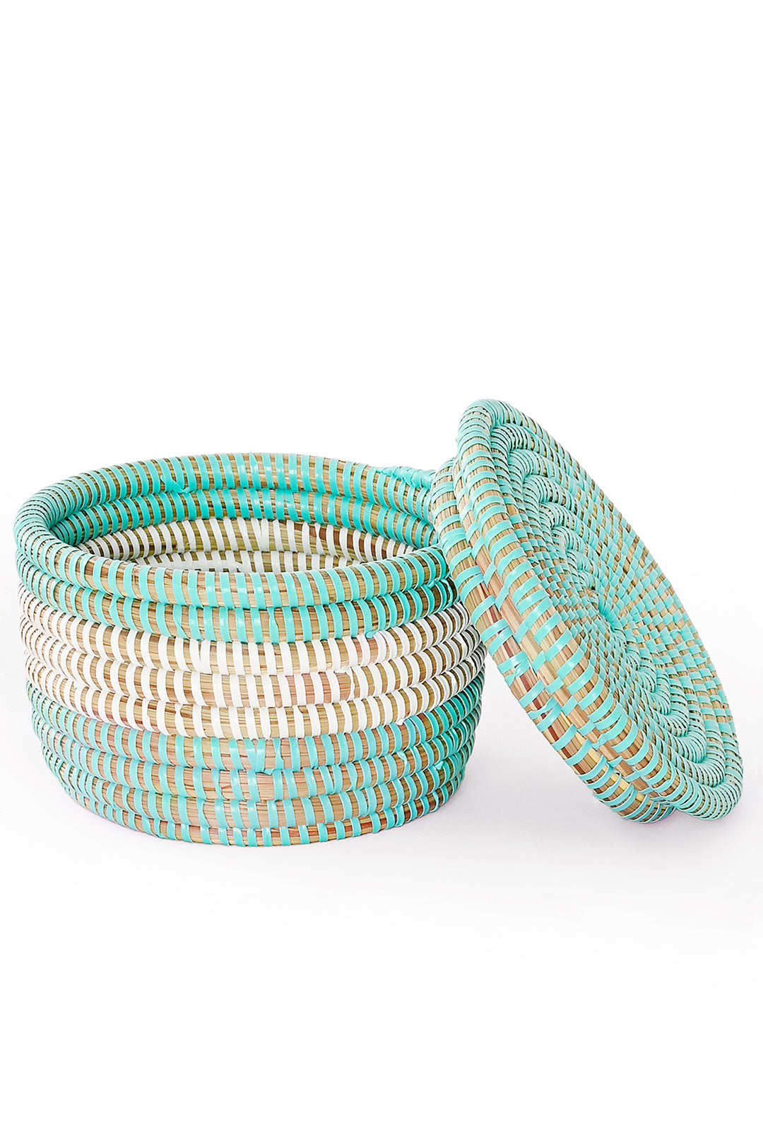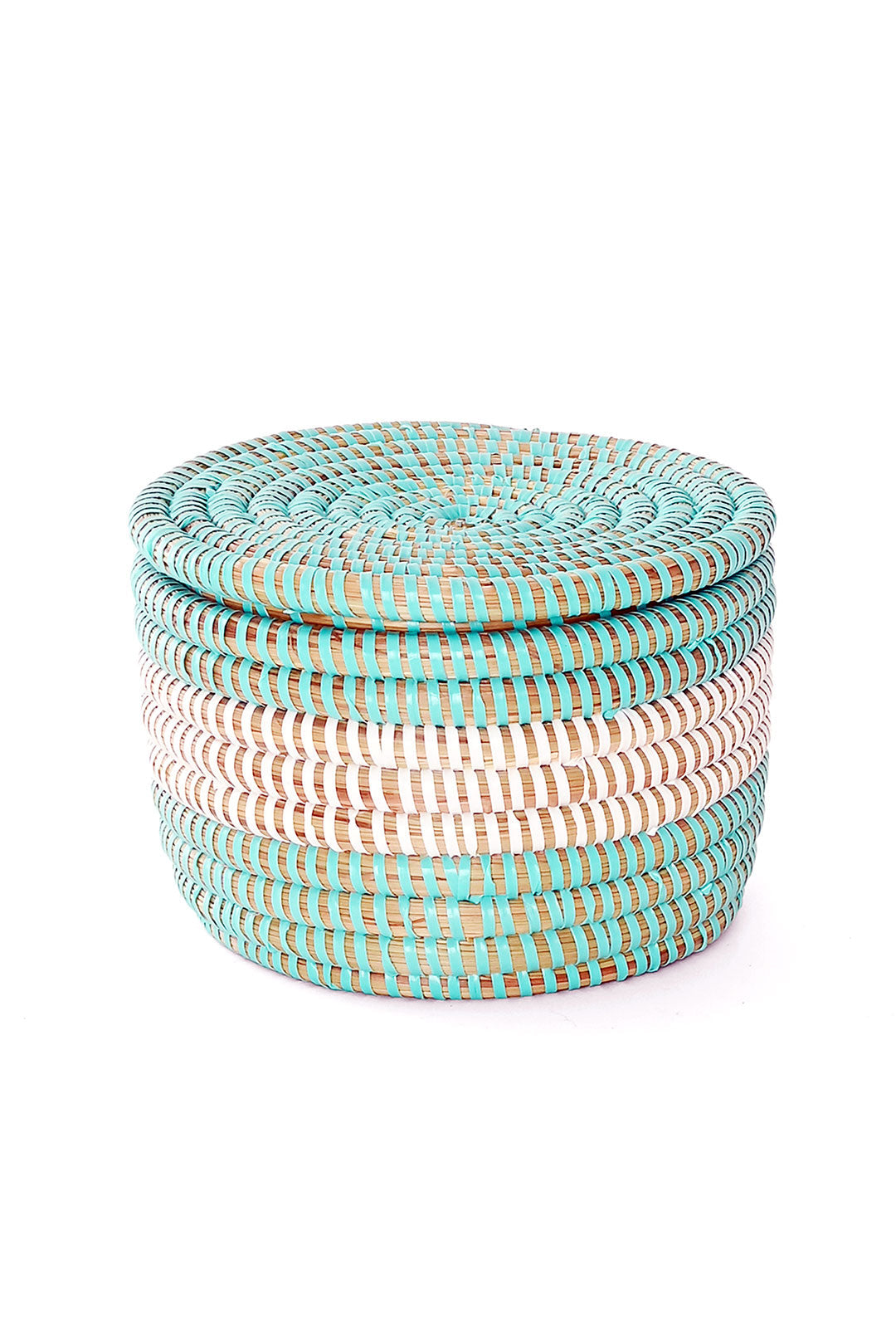 This sweet little lidded tabletop storage basket is reminiscent of a colorful macaron. Crafted from cattail stalks and salvaged plastic strips, each basket makes a lovely small gift.