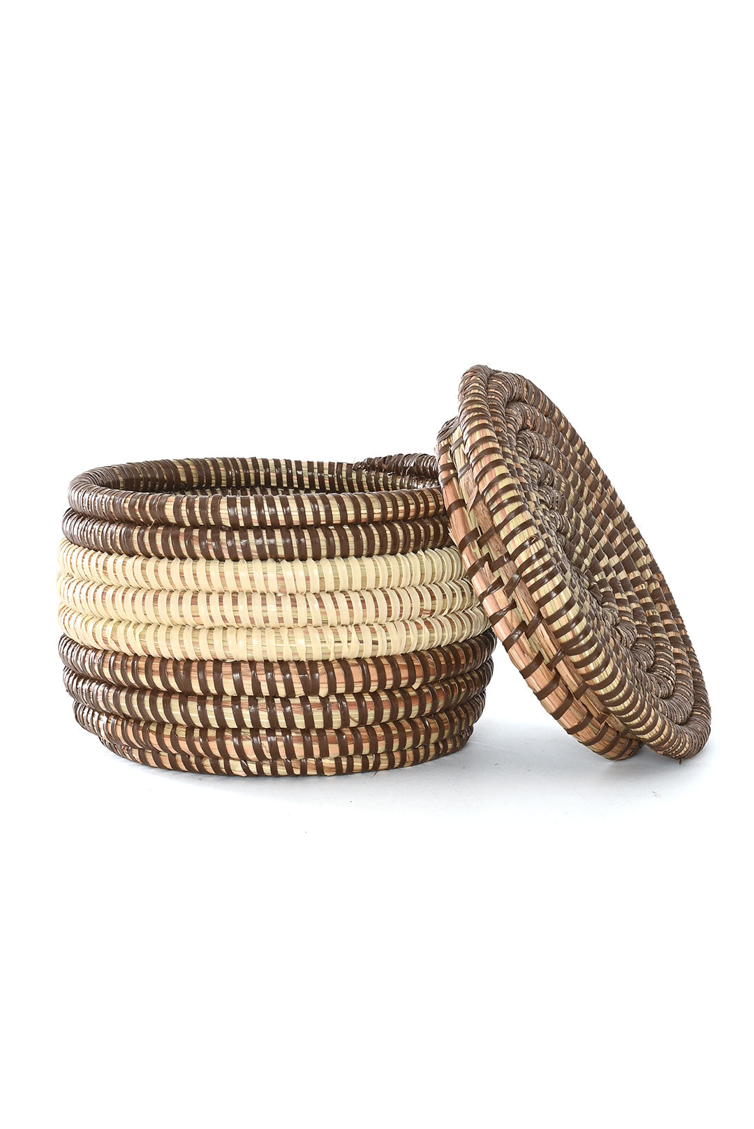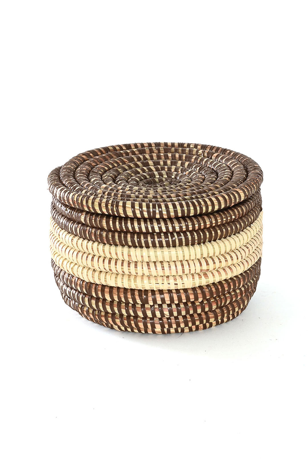 This sweet little lidded tabletop storage basket is reminiscent of a colorful macaron. Crafted from cattail stalks and salvaged plastic strips, each basket makes a lovely small gift.