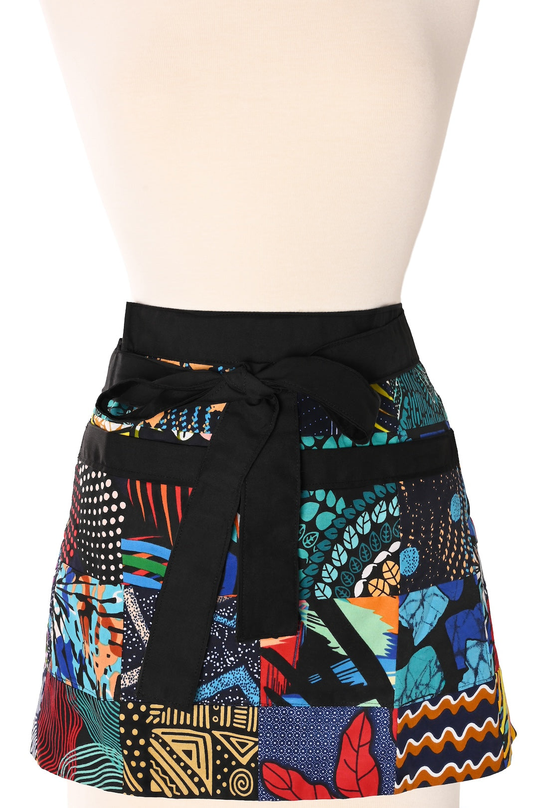 We imagined a wait service waist apron with pockets, and Creation Hive made it appear! The talented artisans of this mission-driven organization in Eldoret, Kenya, stitch colorful kitenge cloth into patchwork, then add black cotton trim, ties and backing for contrast and durability. Two sizable front pockets complete this useful and very eye-catching accessory.