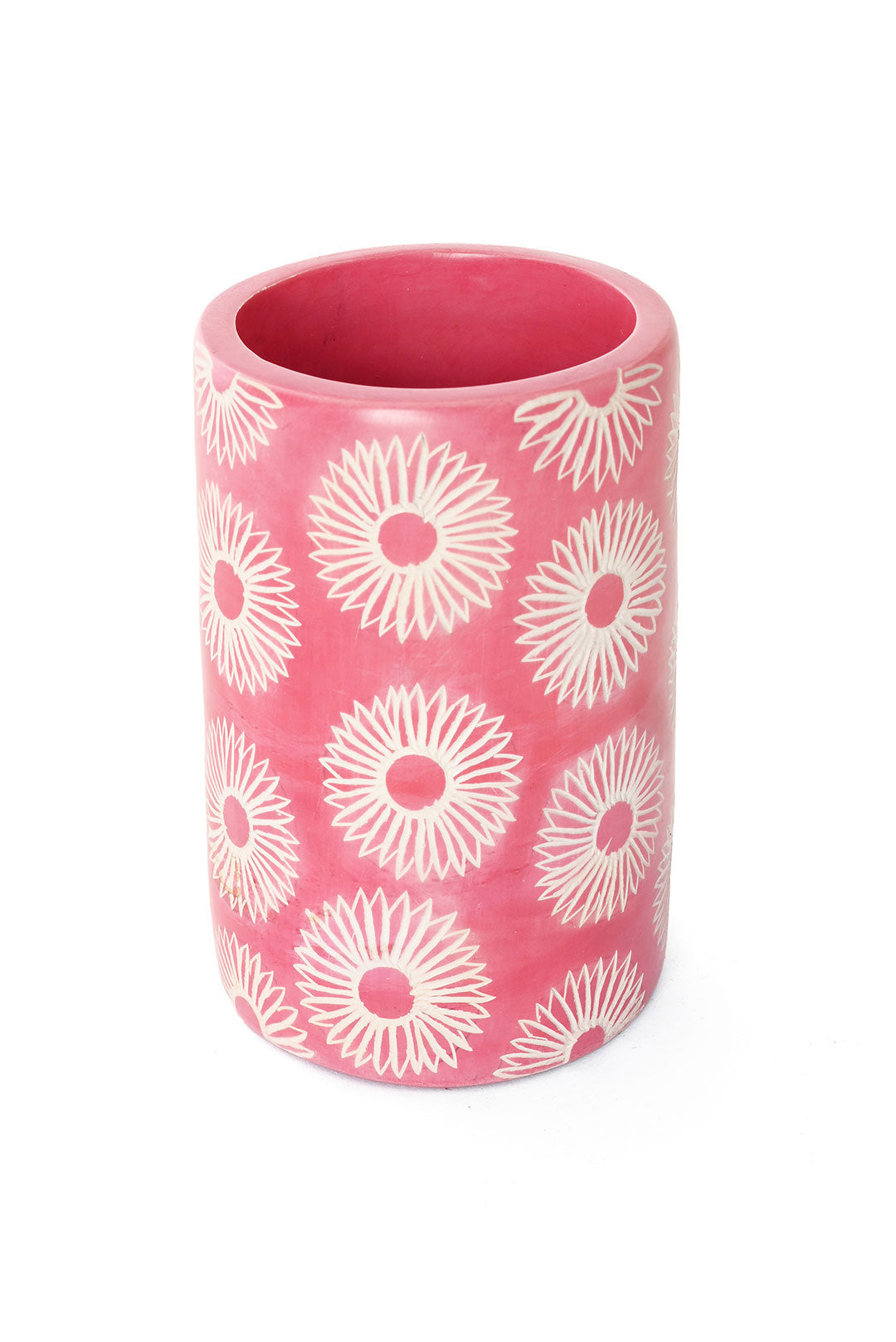 This handcrafted pink pencil cup or vase keeps tabletop organization simple and sweet. Kenyan artisans add a lovely pink finish to a hand carved cylinder, then decorate the surface with scattered etched blossoms. Coordinating items in pink, green and blue are also available!