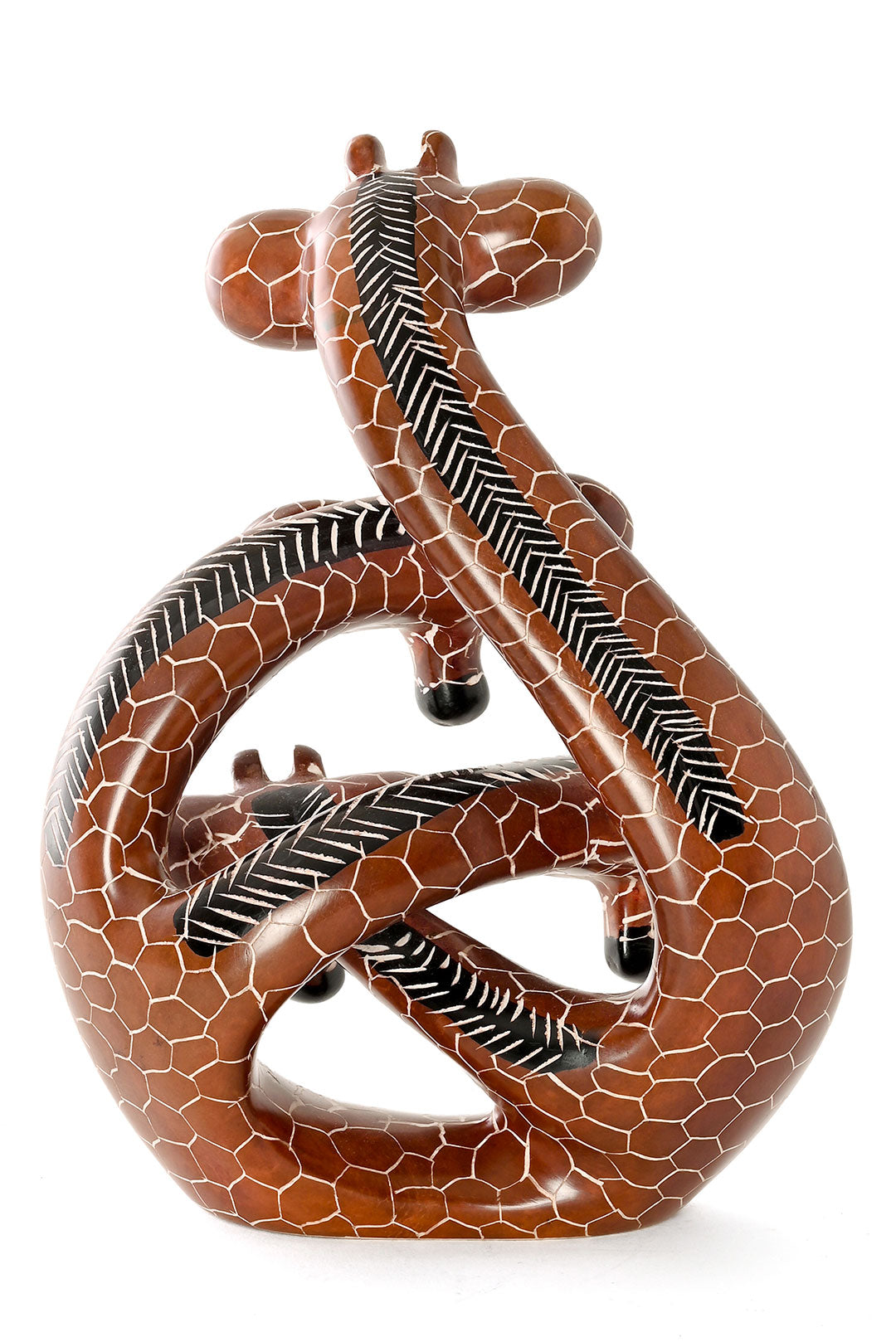 Carvers in Kenya's western highlands carefully extract this intricate sculpture of a family of giraffes from soft soapstone. Artisans in Nairobi add a beautiful dyed brown and black finish and etched details.