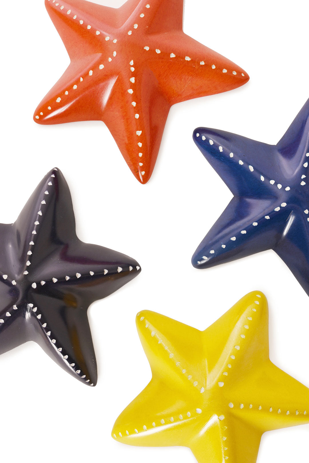 Kenyan artisans hand carve petite sea stars from soft soapstone, then add colorful dye in yellow, orange, blue and purple and etch in details.