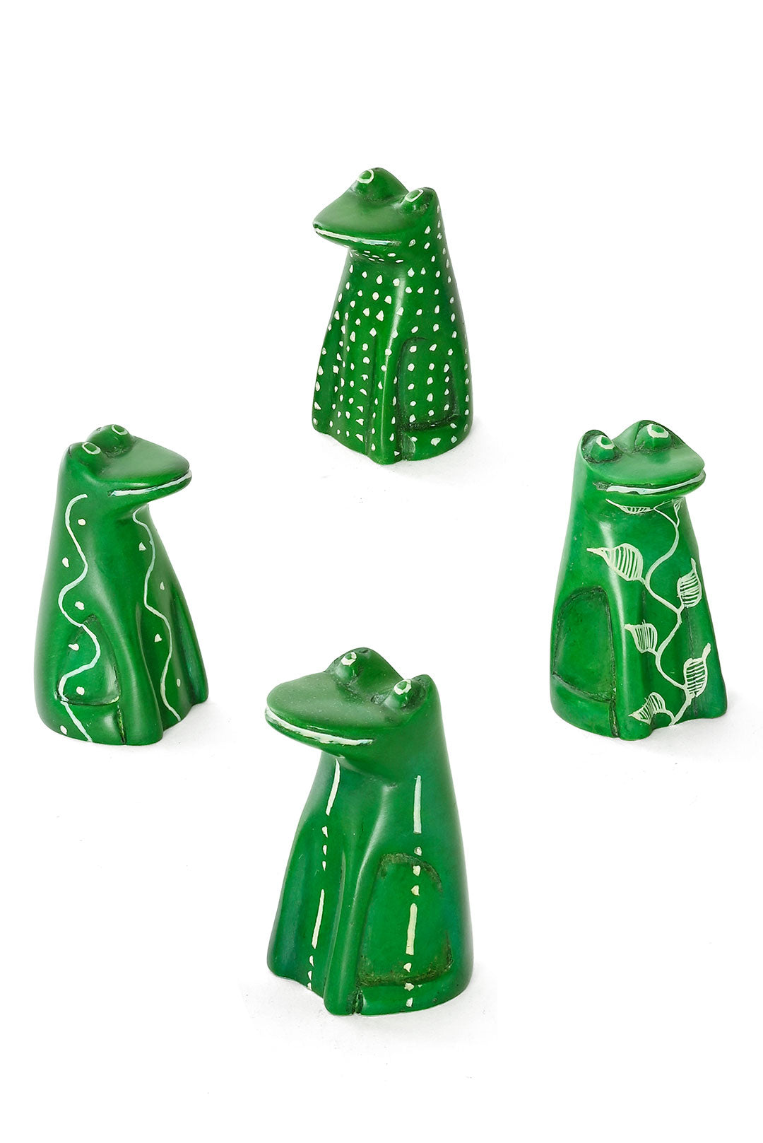 These silly little sculptures are hand carved by artisans in Kenya from soft soapstone, then dyed a vibrant green. To give each frog personality, artisans add googley eyes and etched geometric or floral designs.