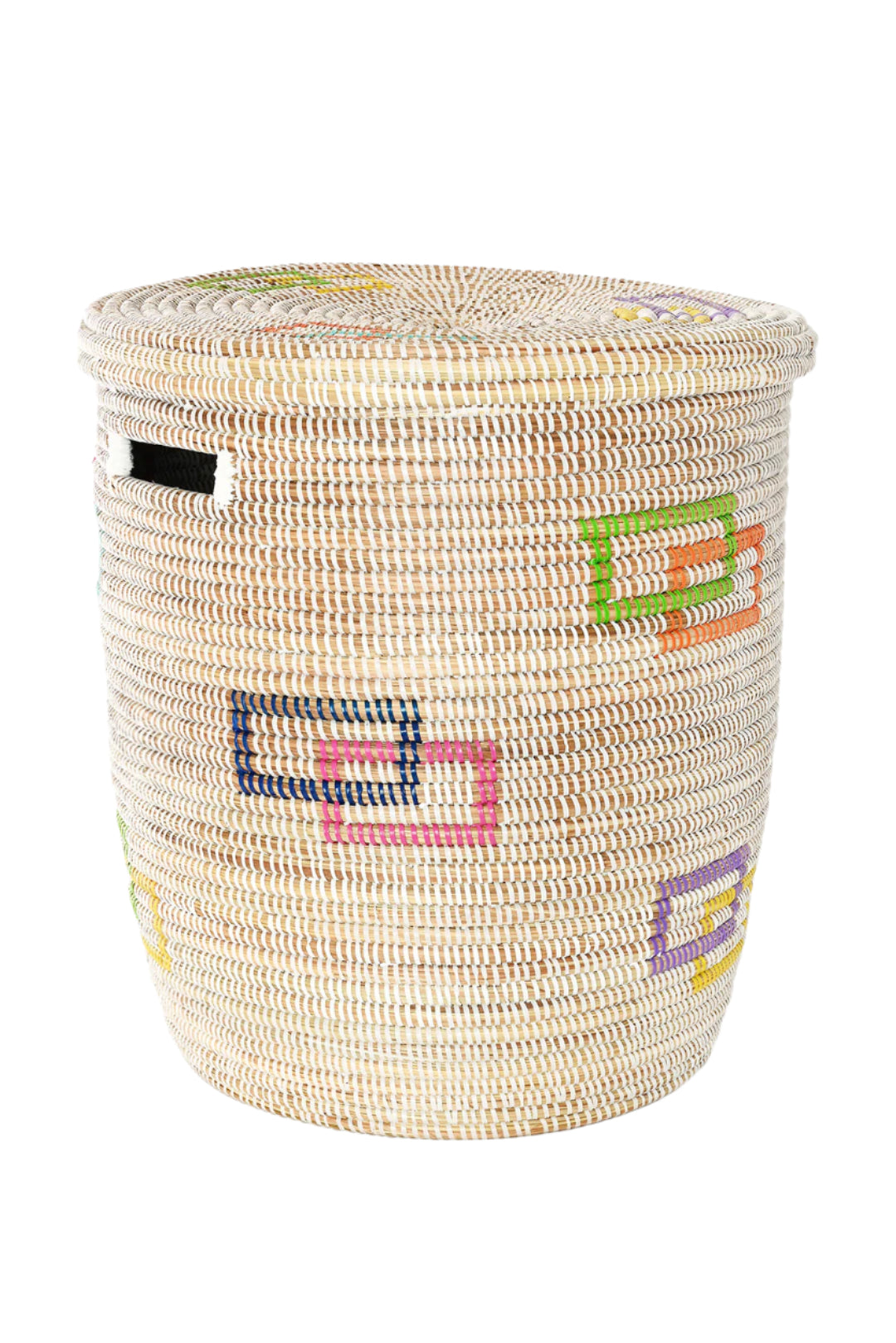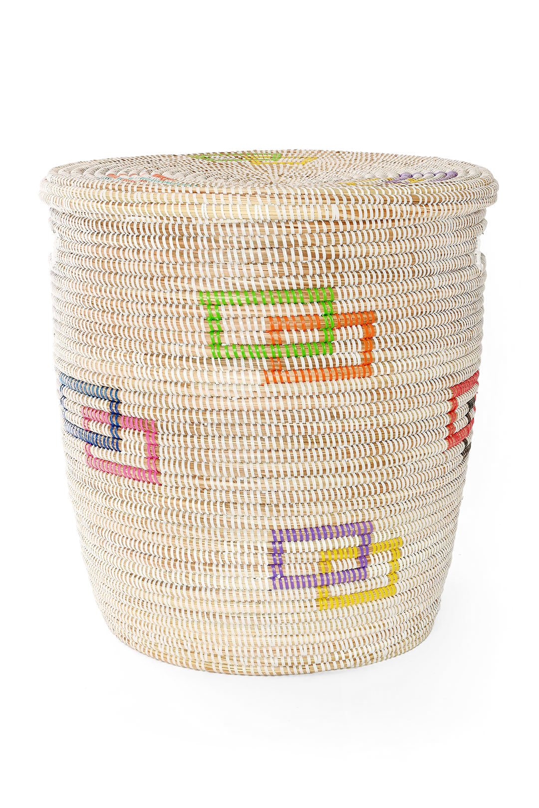 This classic storage hamper features an overlapping lid and cutout handles. We've updated our bestselling Perfect Match pattern with fun colors against a white background.