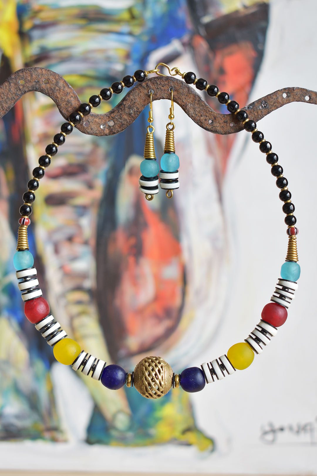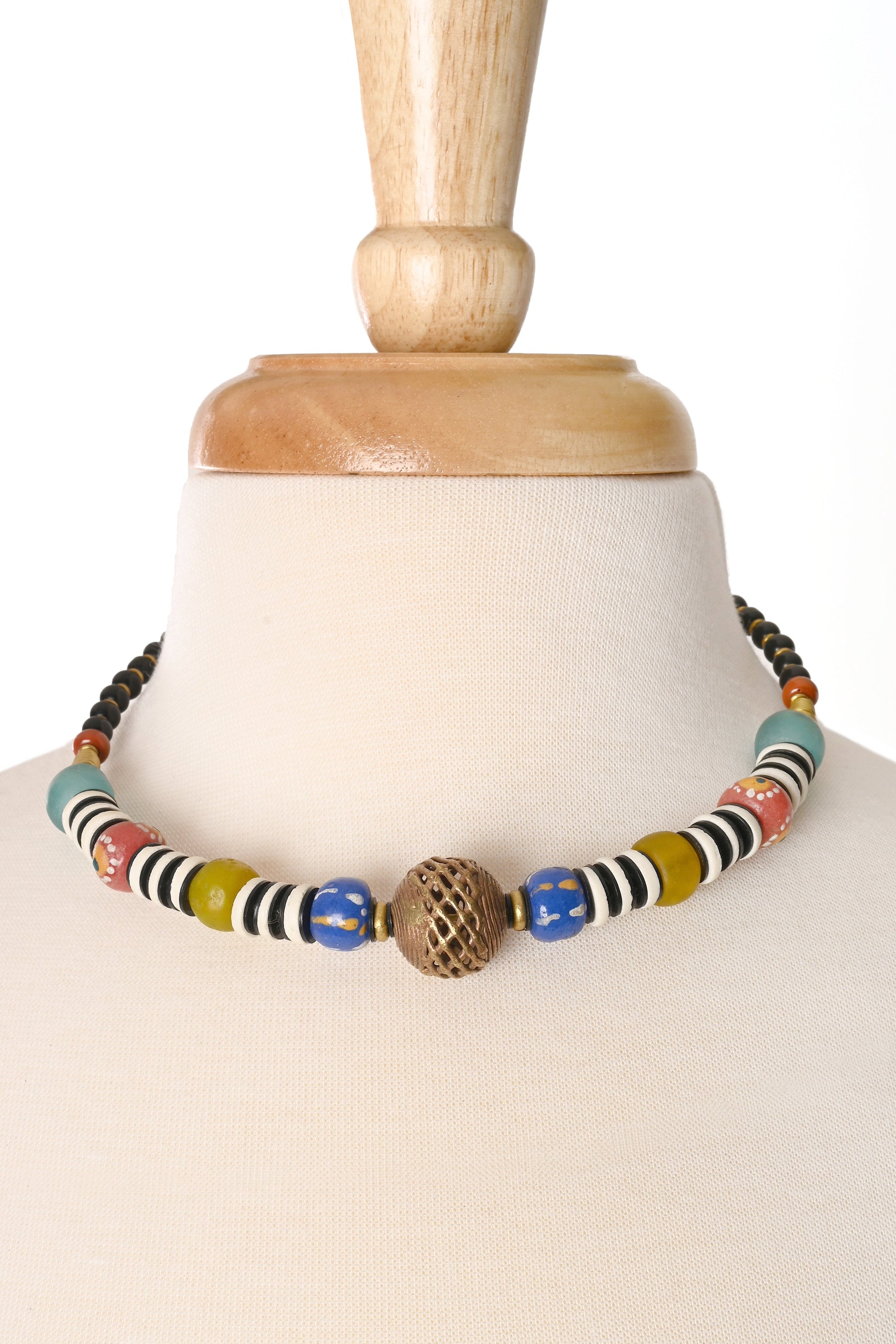 Handcrafted by Kenyan artisans, this vibrant choker necklace features a stylized brass focal bead nestled in with colorful Krobo glass trade beads—made from recycled glass bottles that are crushed, molded, and fired using traditional techniques. Vintage ‘phono’ disk beads, crafted from recycled vinyl records, add a pop of contrast and history. Finished with a row of sleek black beads and a lobster clasp, it’s a striking blend of vintage character and modern style
