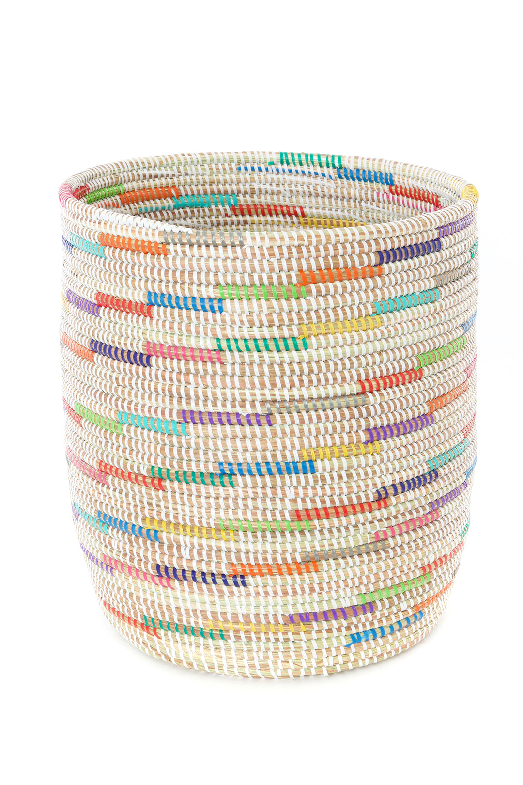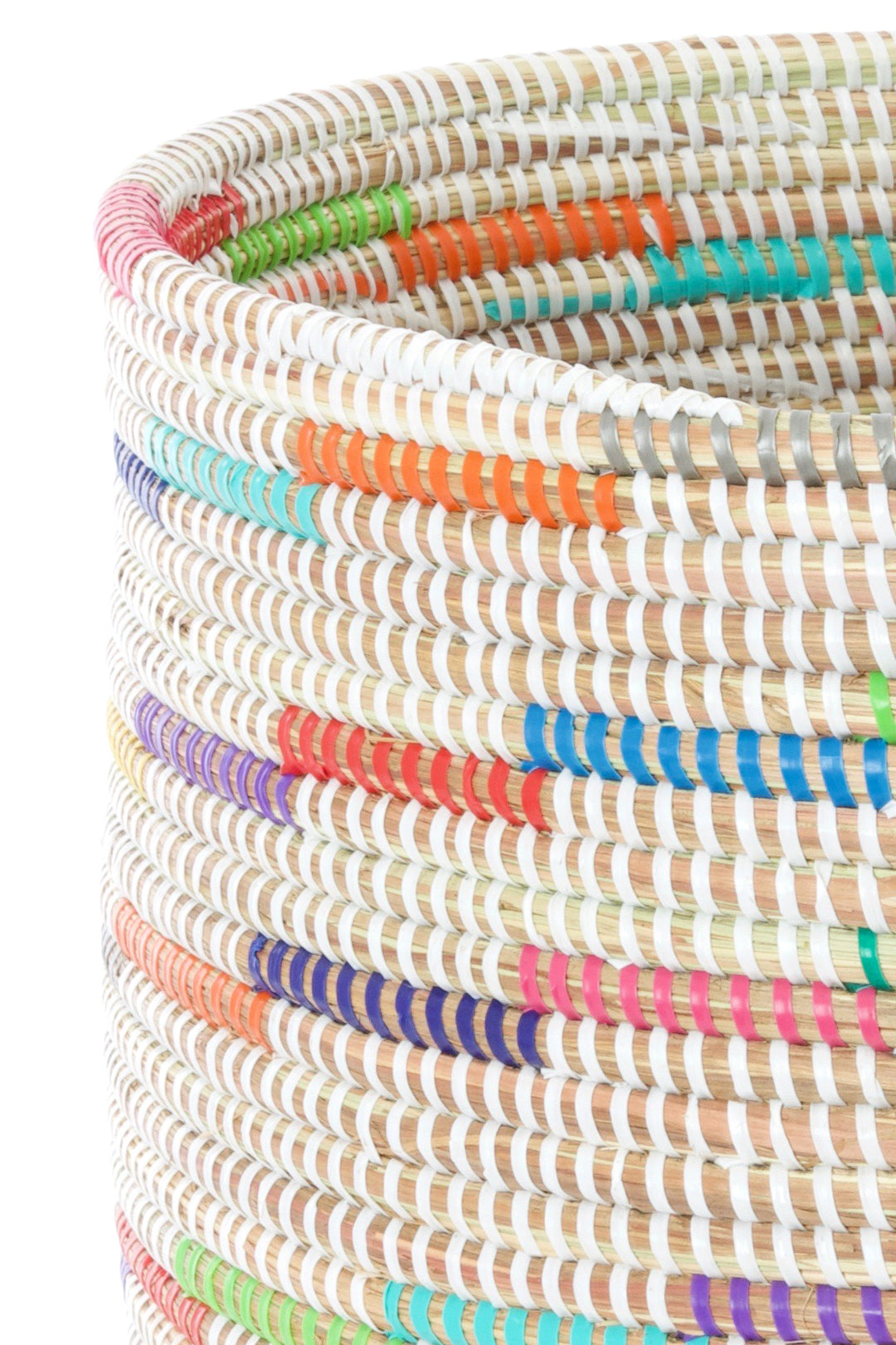 Wolof women in the West African nation of Senegal update traditional coil weaving methods by enlivening natural grass baskets with colorful strips of plastic salvaged from a mat factory. Cattails grow abundantly in rural Senegal, so women can earn a sustainable income from basket weaving while enriching homes around the world with modern African craftsmanship.