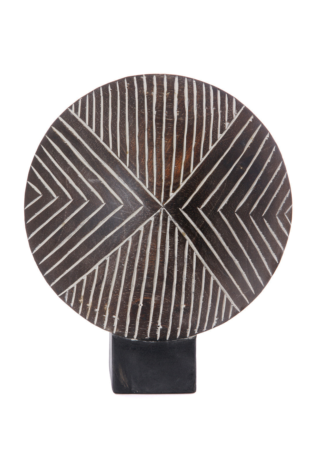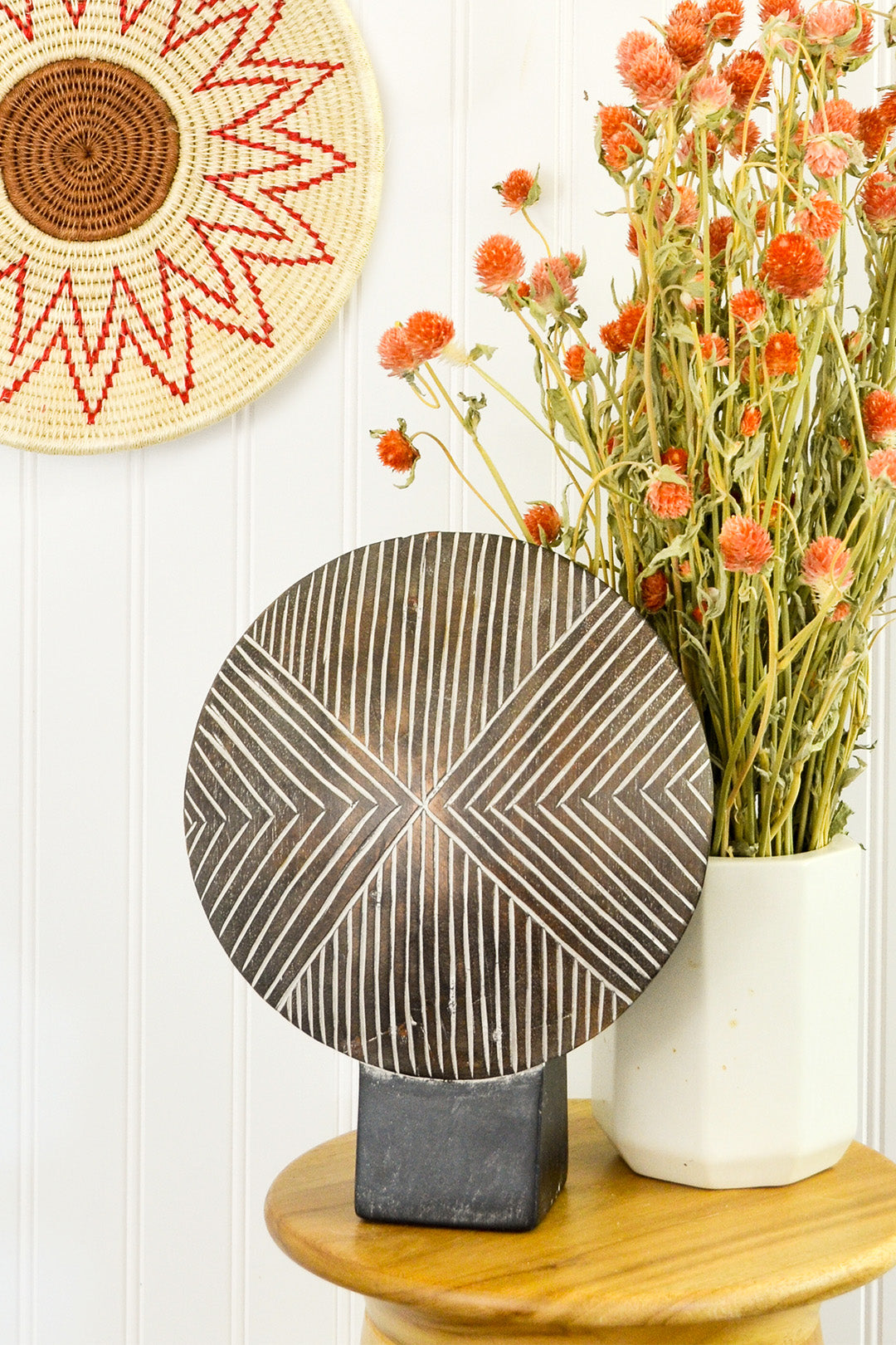 Ghanaian artisans present a modern interpretation of traditional wooden shields made and used by the Bamileke people of Cameroon. Crafted from cedrela wood, these art pieces are styled for display, with the shield and base carved from a single piece of wood.