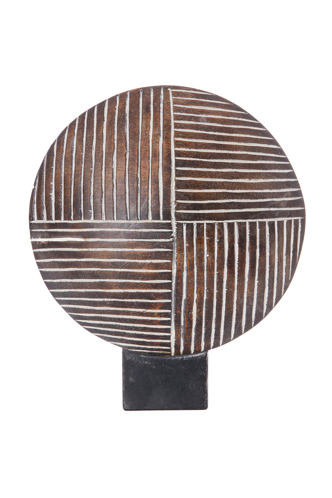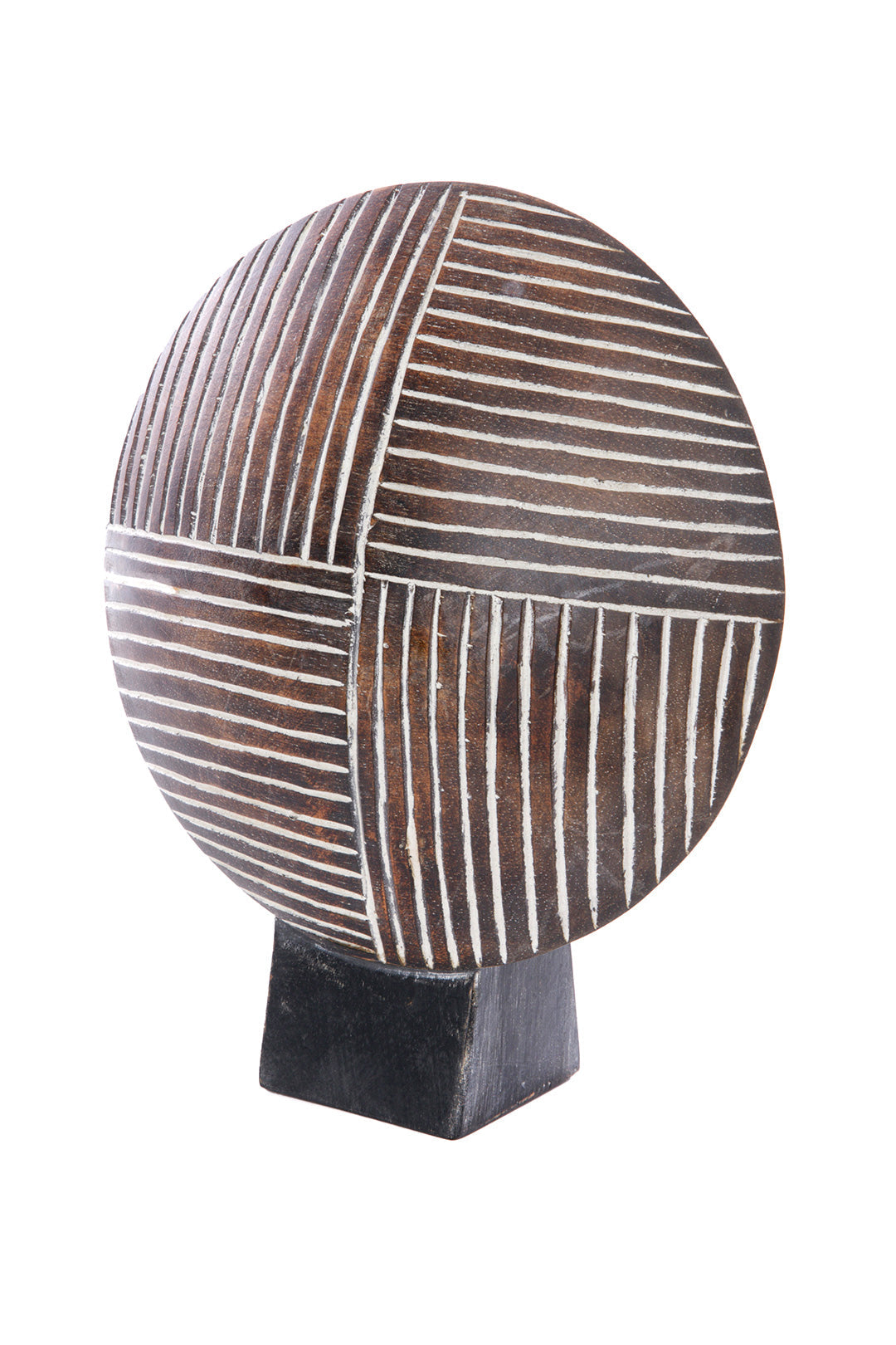 Ghanaian artisans present a modern interpretation of traditional wooden shields made and used by the Bamileke people of Cameroon. Crafted from cedrela wood, these art pieces are styled for display, with the shield and base carved from a single piece of wood.